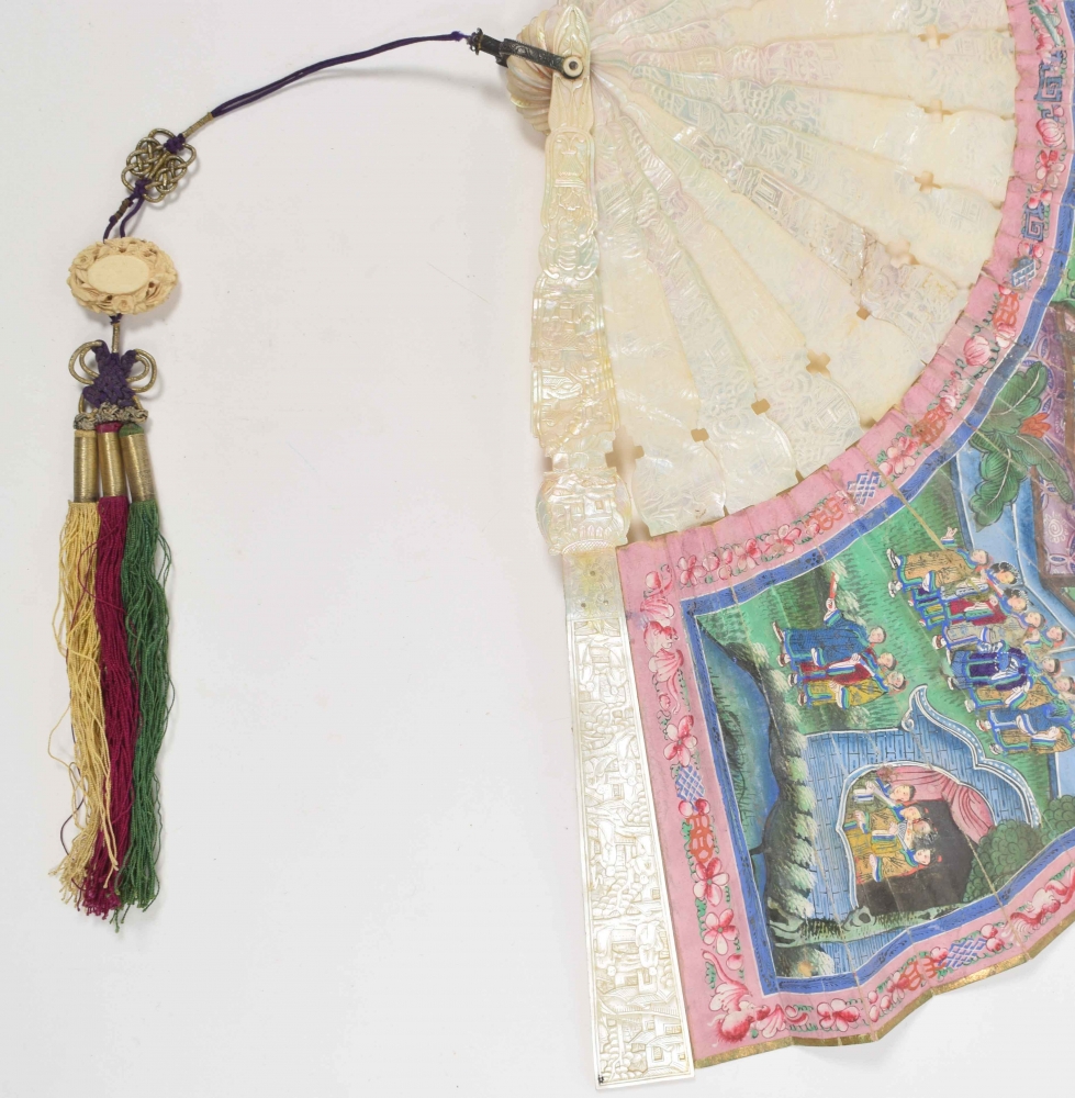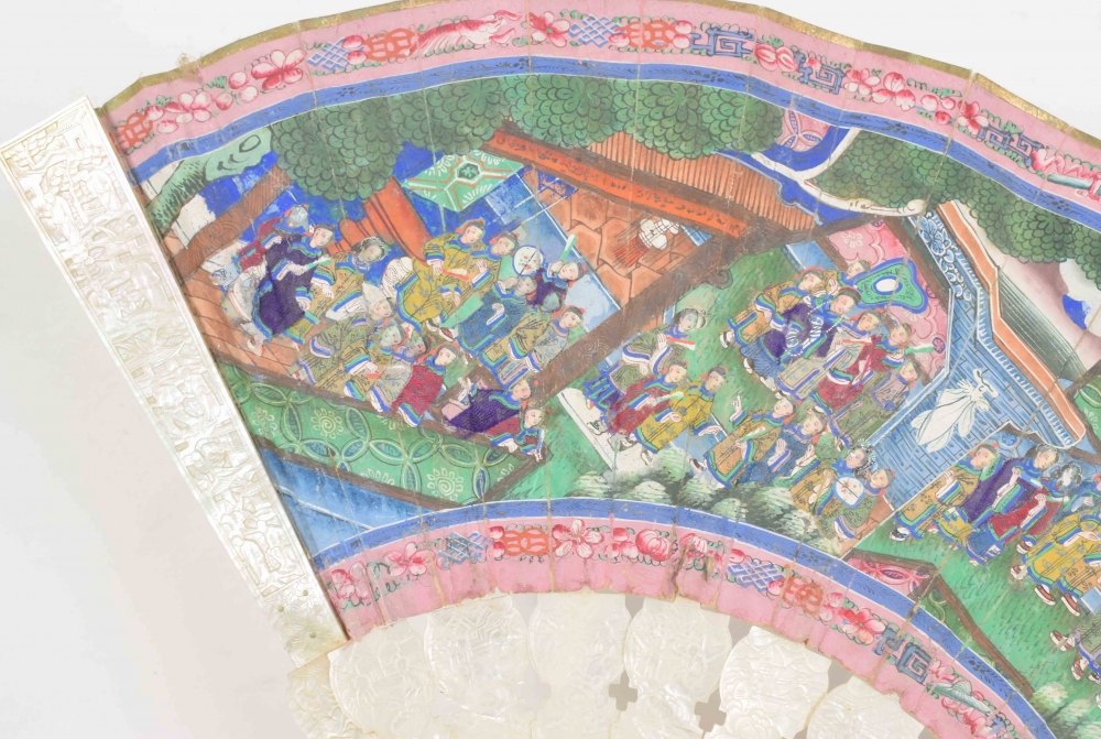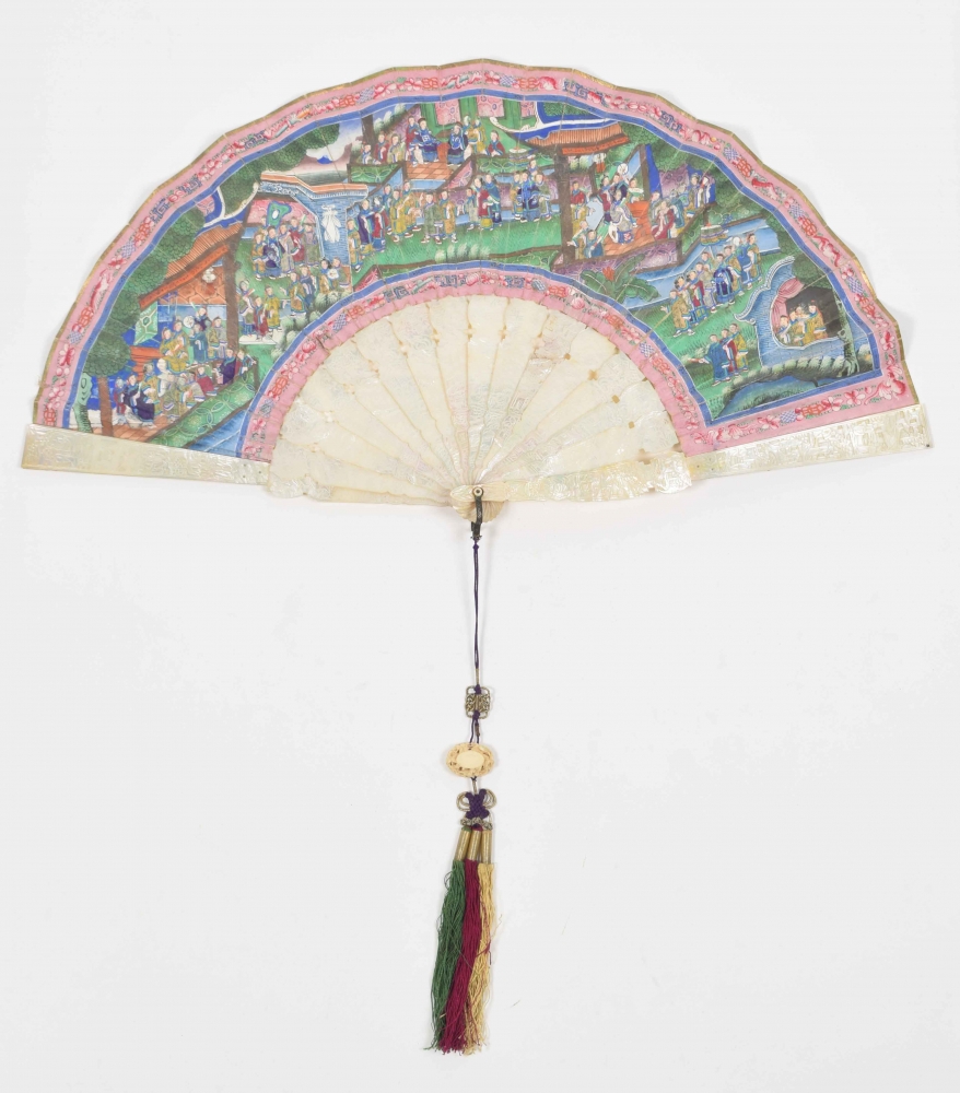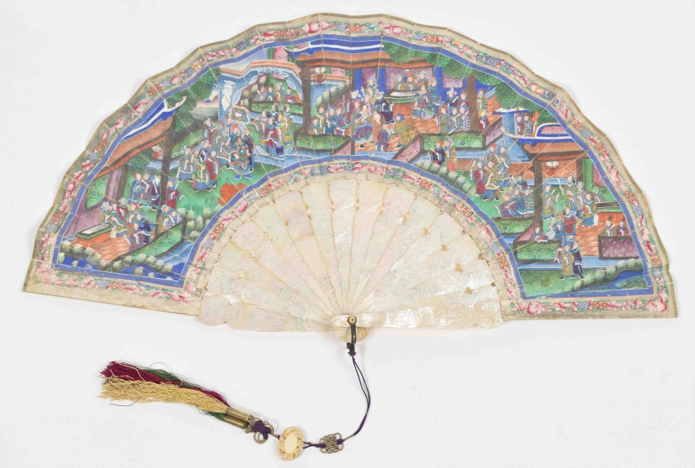 Cantonese painted fan with scene of many figures in temple. The 16 bones of the fan mother-of-pearl with traditional Cantonese decorations. With cord with ivory button. China, mid 19th century. L (folded) 28 cm.