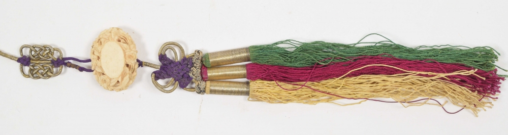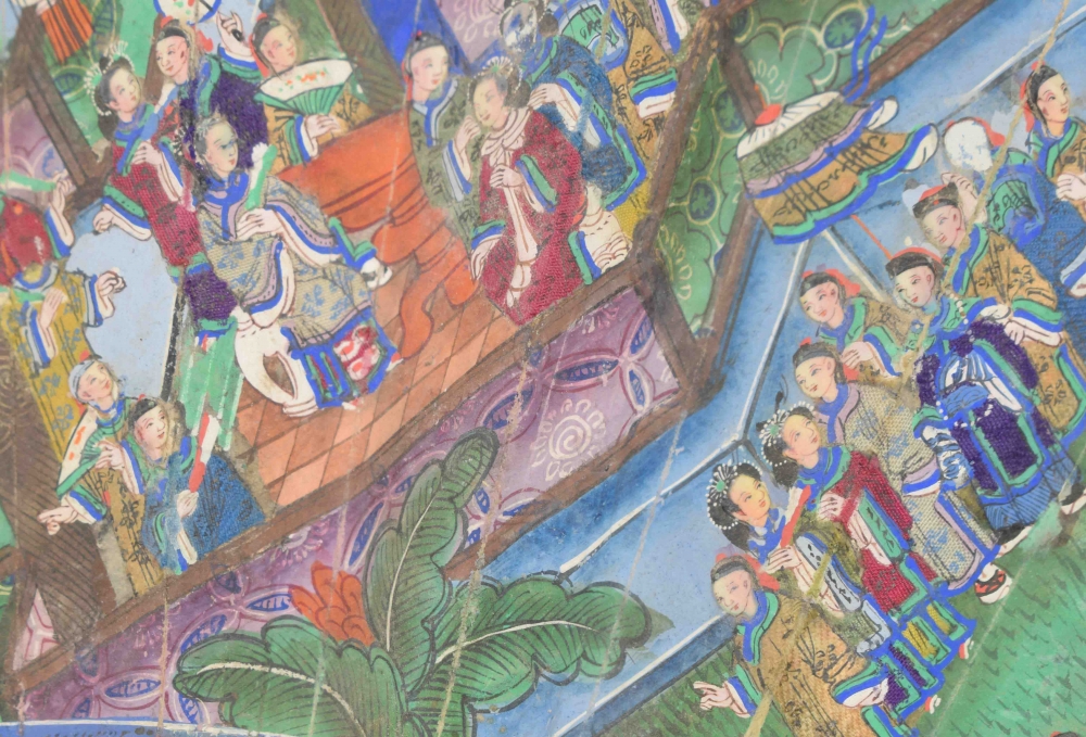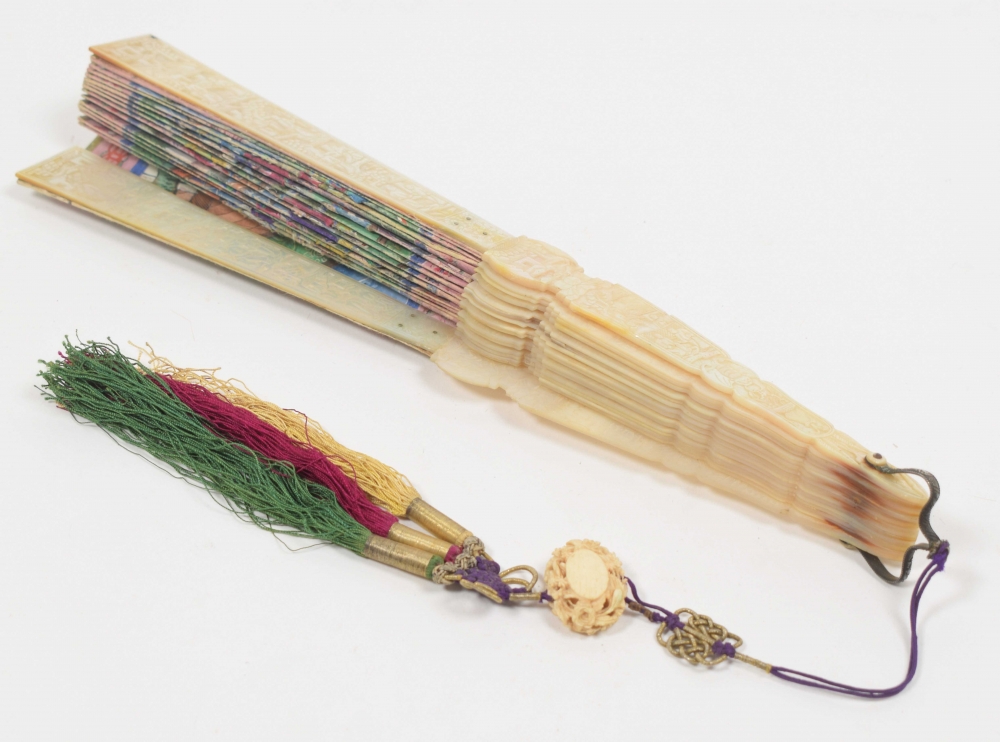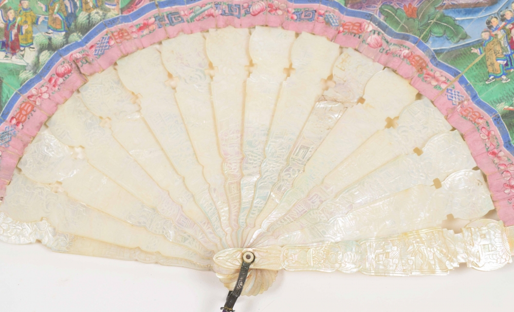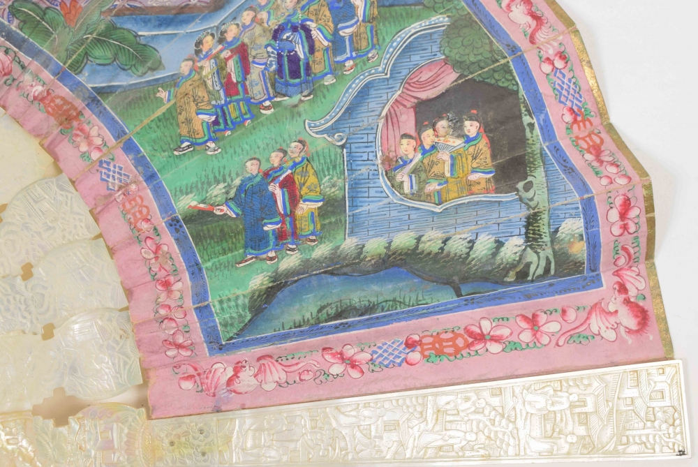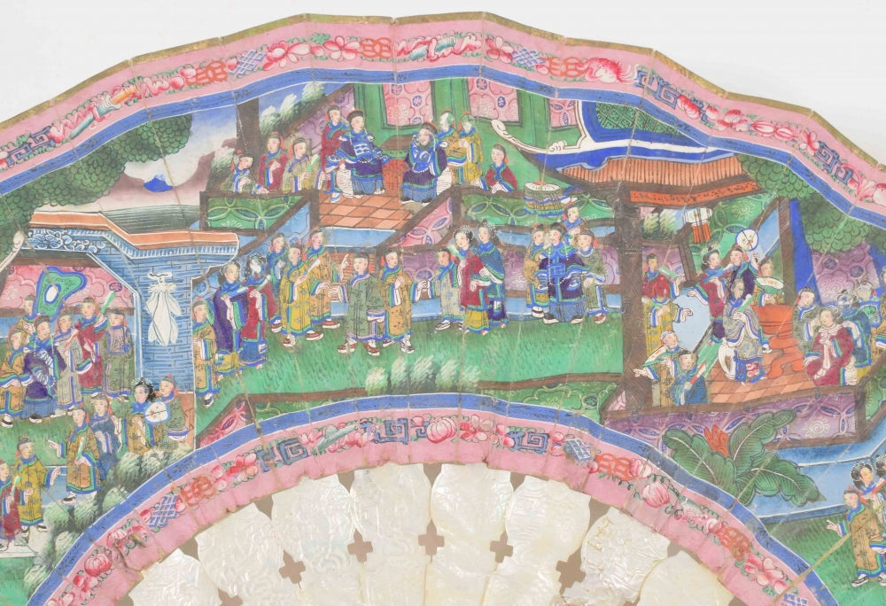 Cantonese painted fan with scene of many figures in temple. The 16 bones of the fan mother-of-pearl with traditional Cantonese decorations. With cord with ivory button. China, mid 19th century. L (folded) 28 cm.