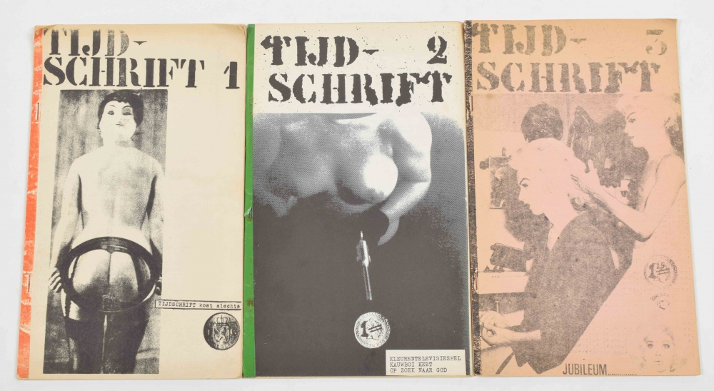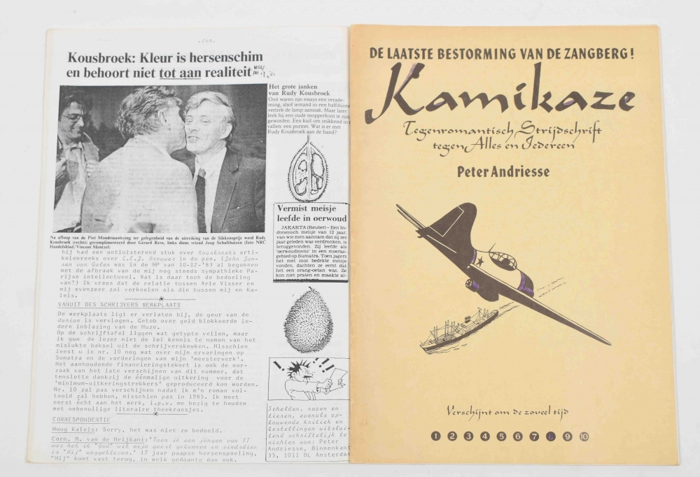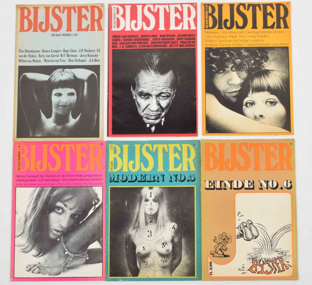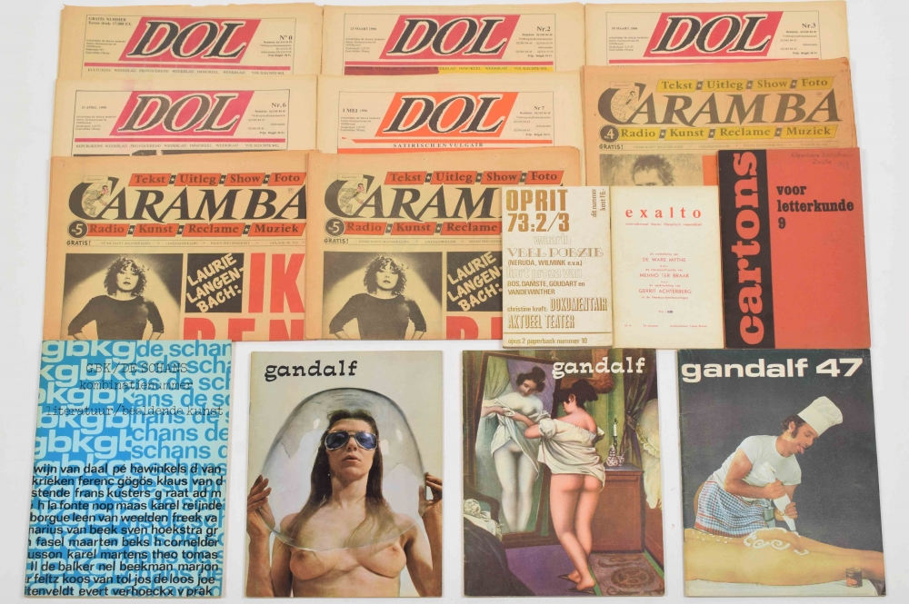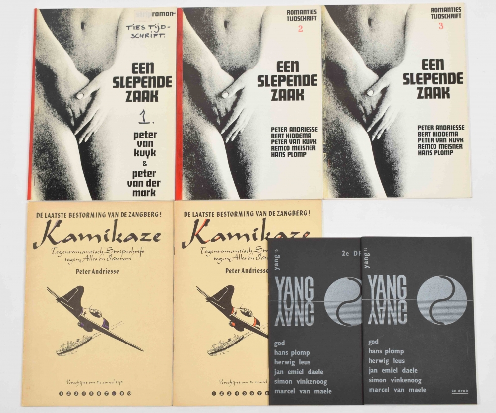 Tijdschrift 1-3. Jacobus P. Bos and Antonie C. Spuijbroek, c. 1966 + Een slepende zaak 1-3. Peter Andriesse, Bert Hiddema, Peter van Kuyk, Remco Meisner, Hans Plomp, c. 1982 + Yang 15 (2x). 2nd ed. Flemish-Dutch bimonthly. Jan E. Daele, Hans Plomp, 1966 + Bijster no. 1 and no. 6, 1969-1970 + Kamikaze. Tegenromantisch Strijdschrift tegen Alles en Iedereen. Nr. 8 and 9, 1983. Edition of 100 copies each - and 15 more.