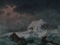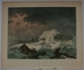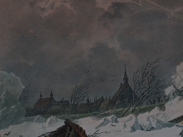 Handgekleurde kopergravure, 50 x 61 cm. Voorstelling van afdrijvende ijsschotsen die Gorcum verwoestten in 1799. "(..)Deze Plaat die eene der geduchtste verschijnzelen der natuur voorsteld zij daarvan tot een blijvend Gedenkteken bestemd".