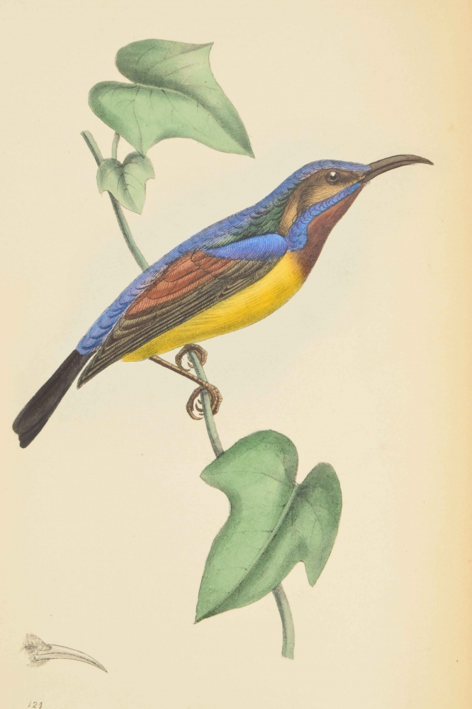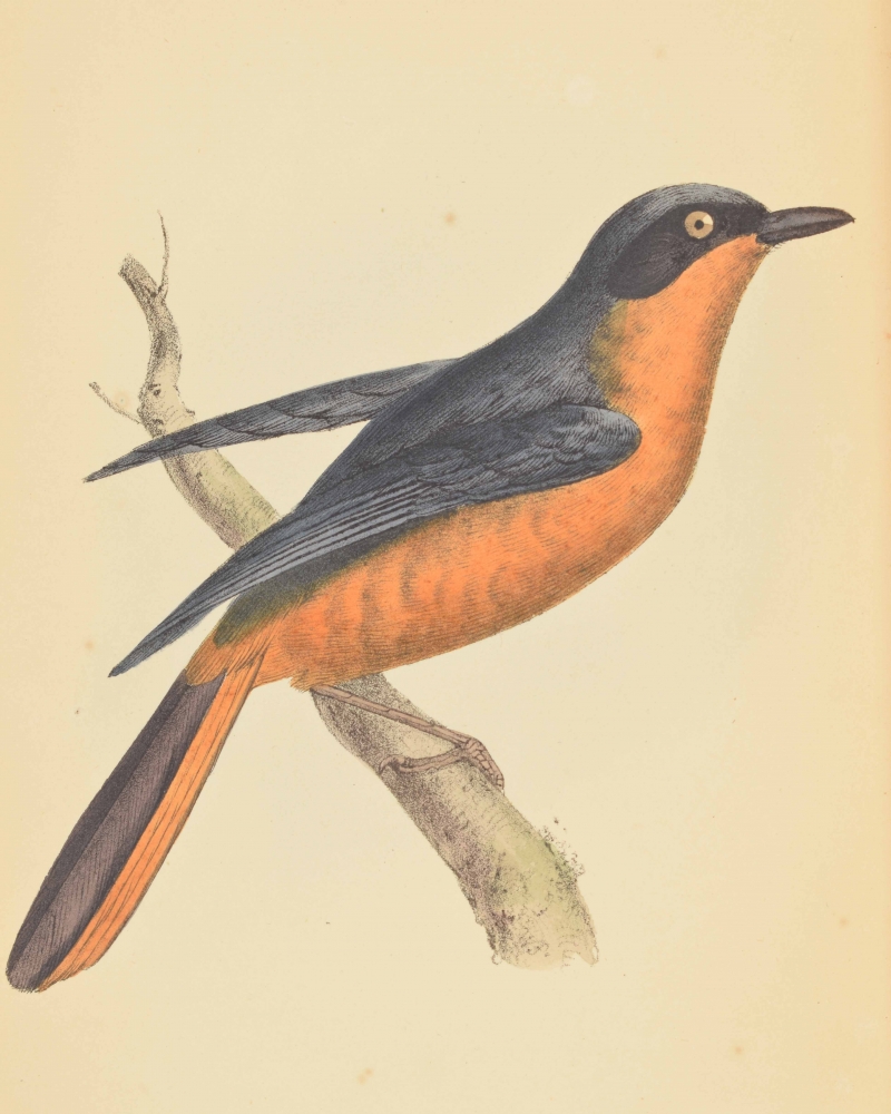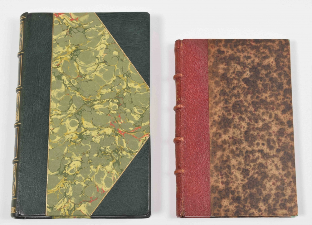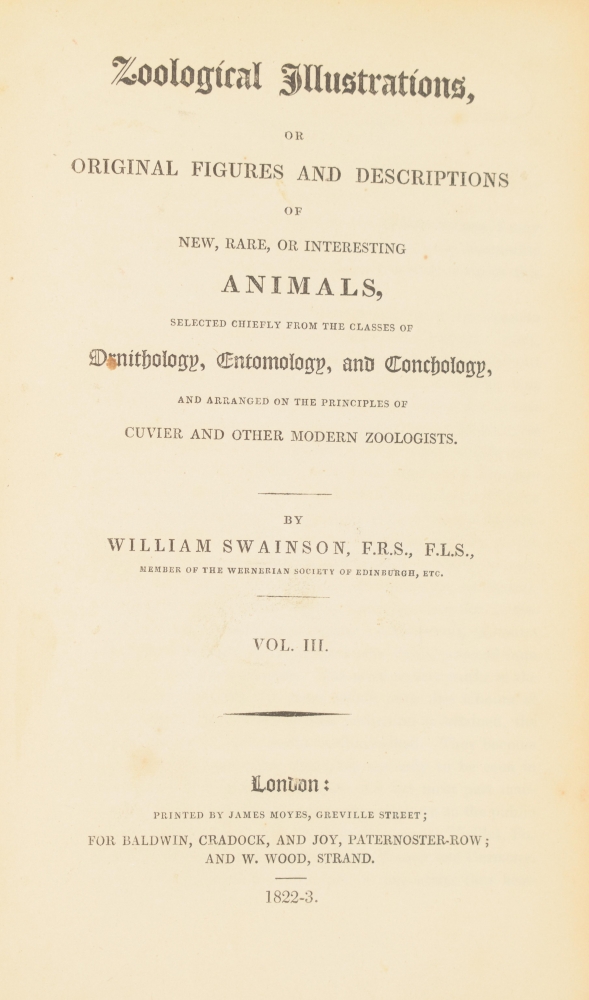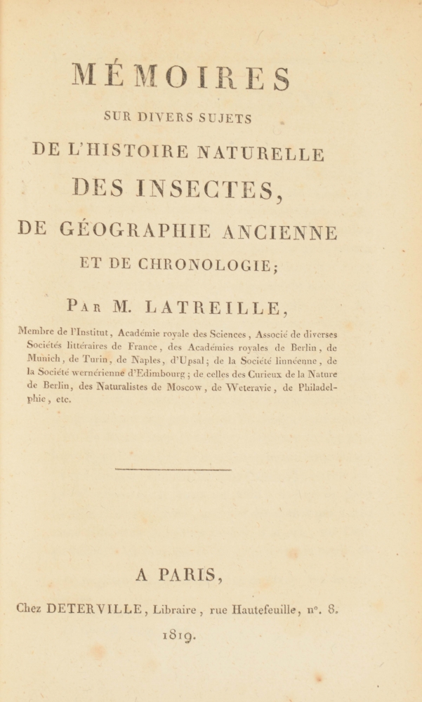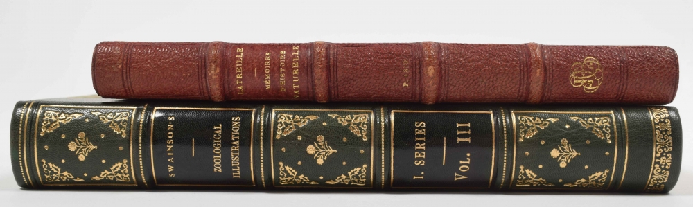 or Original Figures and Descriptions of New, Rare, or Interesting Animals. Vol. III. W. Swainson. London, Baldwin, Cradock & Joy, 1822-1823. With 63 handcoloured lithographs. Later half morocco with gilt and ribbed back. Clean copy + Mémoires sur divers sujets de l'histoire naturelle des insectes, de géographie ancienne et de chronologie. Pierre André Latreille. Paris, Deterville, 1819. VIII, 264 p. Half red morocco, ribbed and gilt back. 8vo. Binding sl. worn on joints and corners.