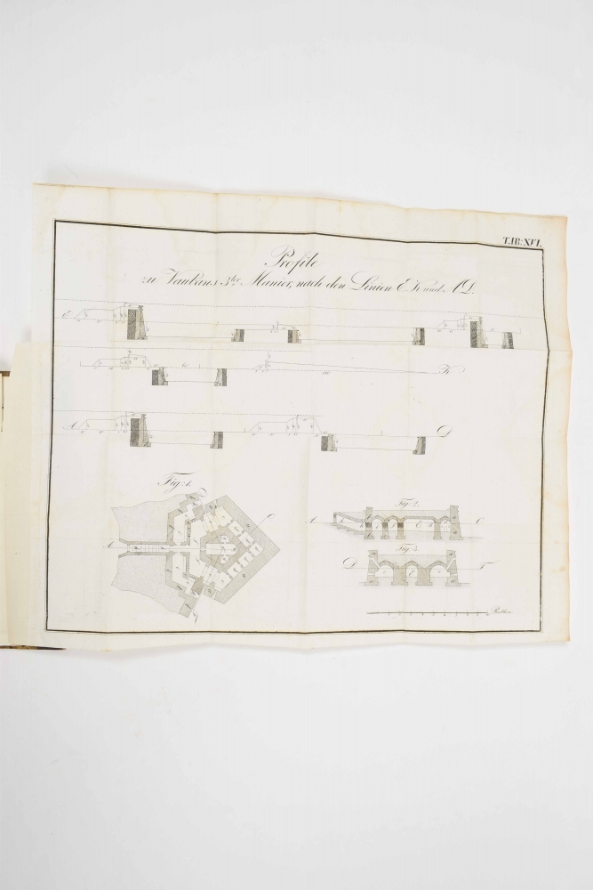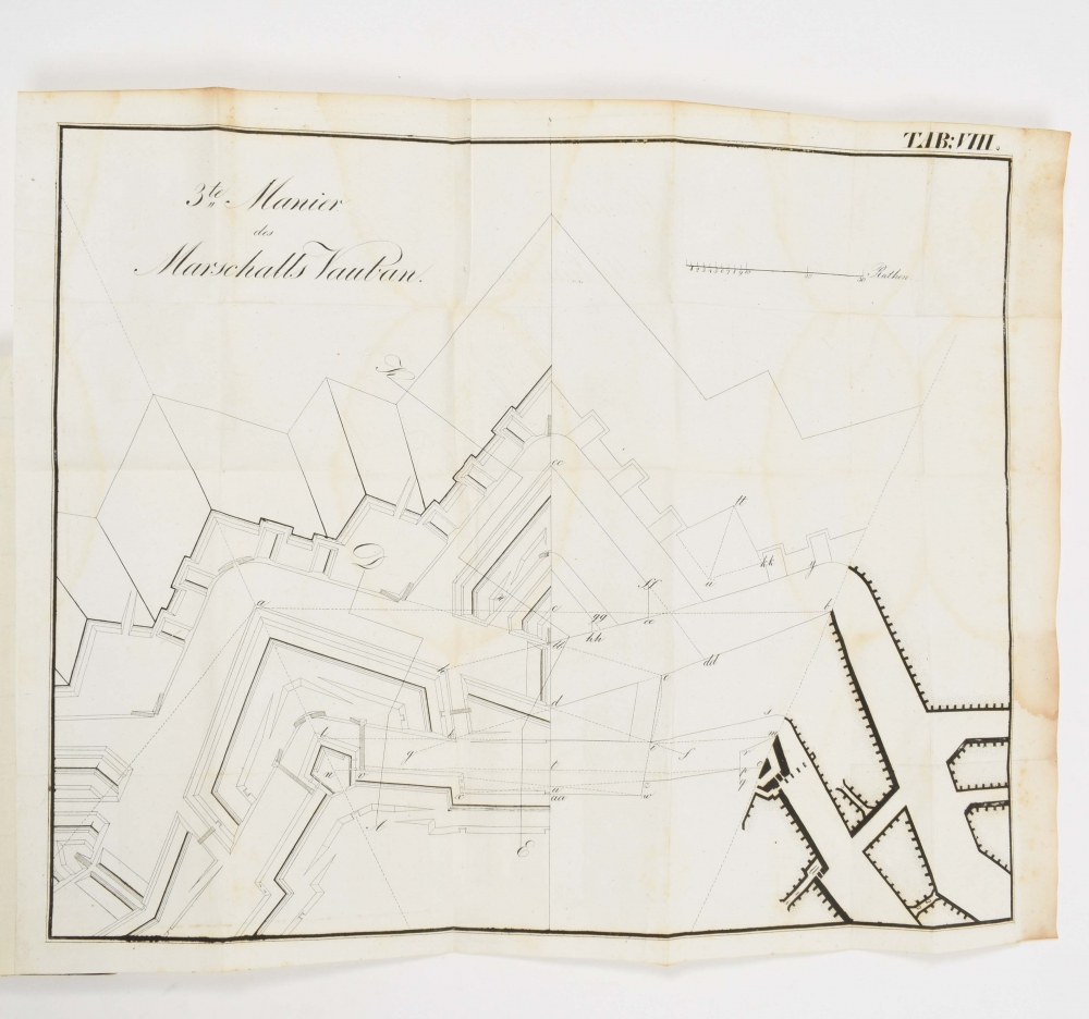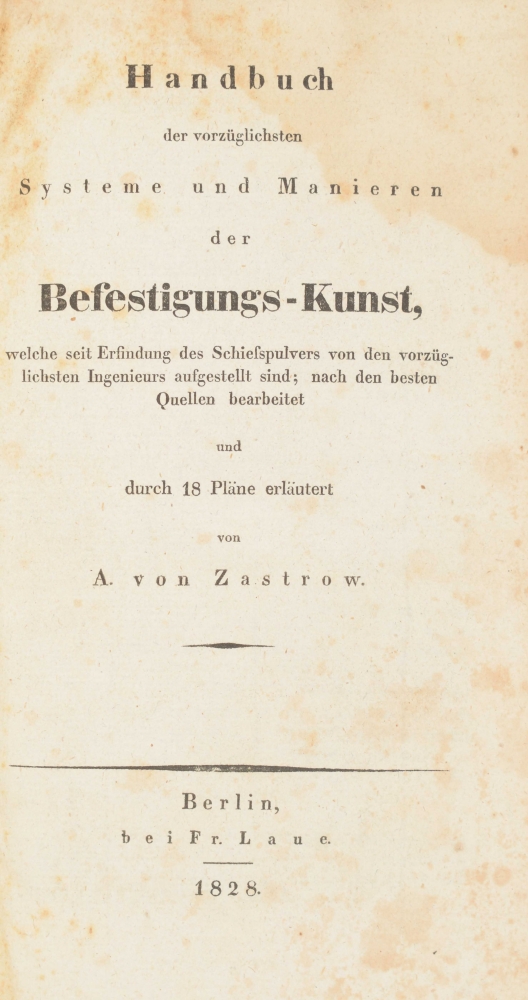 und Manieren der Befestigungs-Kunst. Adolf von Zastrow. Berlijn, fr. Laue, 1828. 1st ed. XII, 120 pp. With 18 folding engravings. Halfleather, title on spine vignette. 8vo.