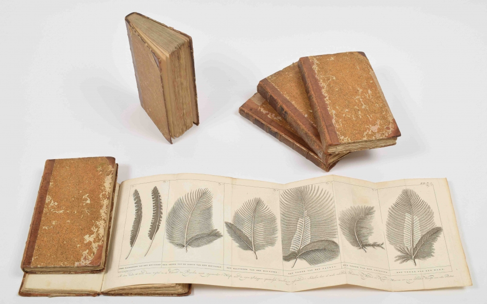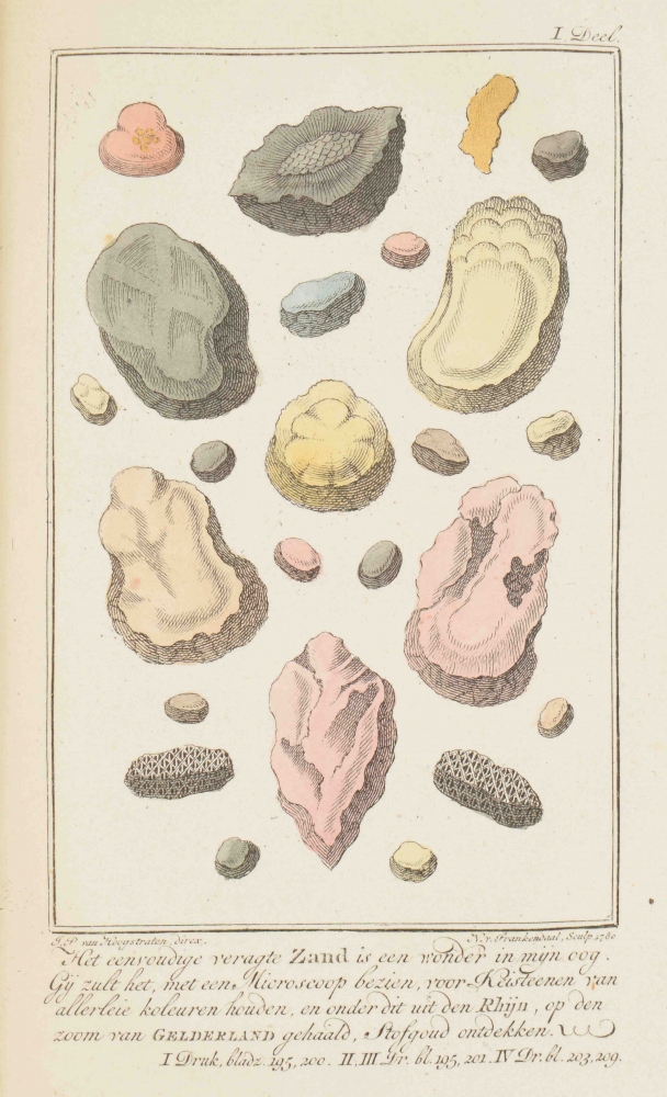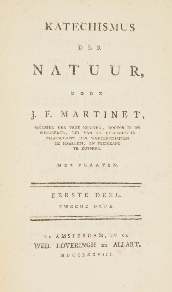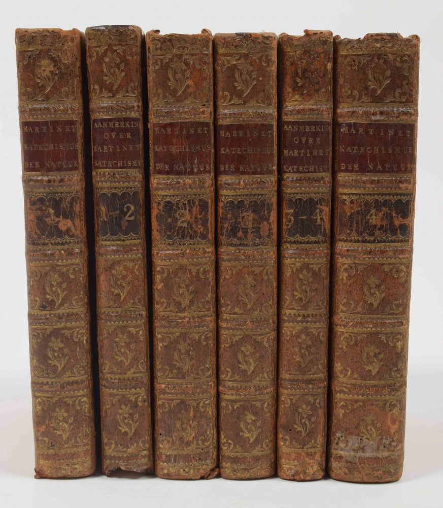 Kathechismus der Natuur. [4 parts]. J.F. Martinet. 2nd ed. Amsterdam, Wed. Loveringh & Allart, 1778-1779. 4 vols., halfleather, uniformly bound, 4x illus. frontispiece, 4x title, altogether ± 1700 pp. and 20 copper-engraved plates, most of which folding. Combined with: Natuurkundige en ophelderende Aanmerkingen over de 4 delen van J.F. Martinet's Katechismus der Natuur door J. de Vries. Amsterdam, Johannes van Selm, 1779. 2 vols., halfleather, uniformly bound with the former work, 2x title, ± 770 pp. Good set, all bindings with traces of use.