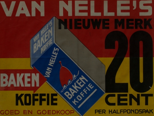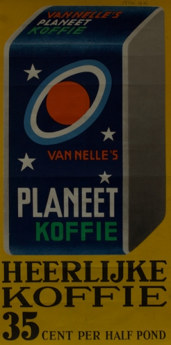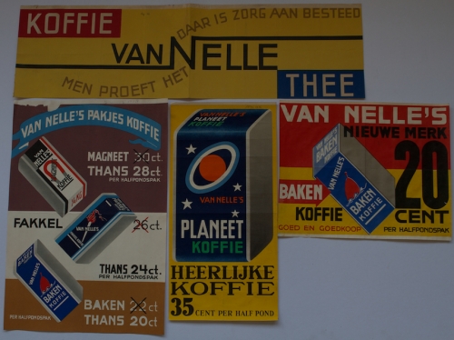 See the Dutch description: Koffie van nelle Thee. Daar is zorg aan besteed. Men proeft het. Jac. Jongert. Grote wikkel, 18 x 64,5 cm. In klein met pen opschrift "aug '46". Scheurtje midden gerest. +Van Nelle's Nieuwe merk Baken Koffie. 24,5 x 31 cm. + Van Nelle's Planeet Koffie. Heerlijke Koffie. 35 cent per half pond. 39 x 19,5 cm. Klein met pen opschrift "mei 1936". - en 1 andere.