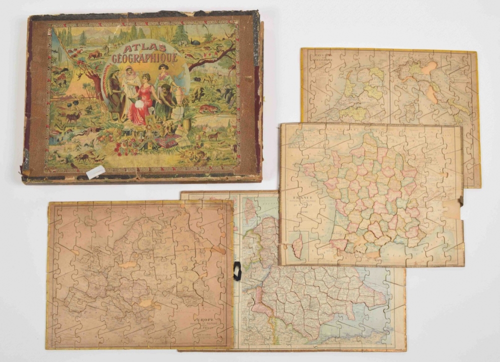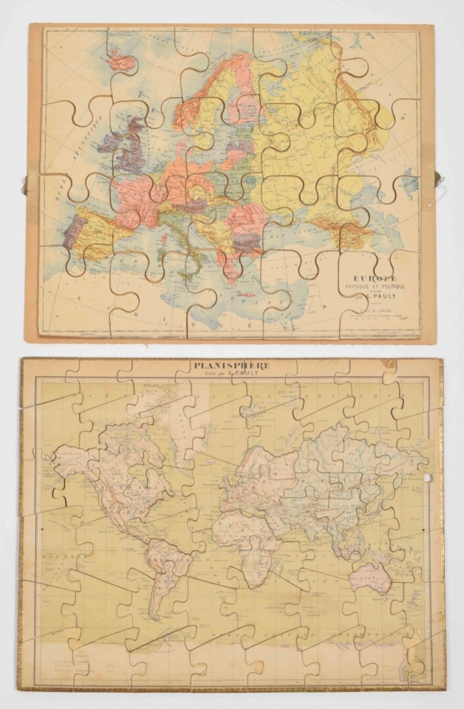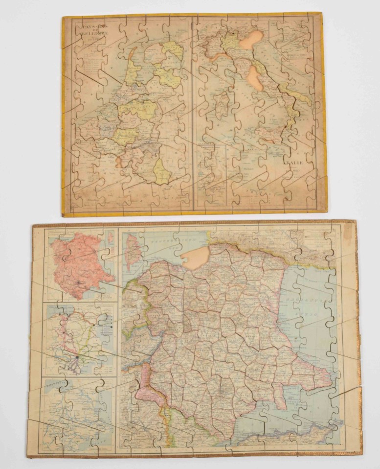 6 complete puzzles: Europe (29 x 35 cm, 20 pcs.), world (30 x 38 cm, 64 pcs.), world (31 x 41.5 cm, 56 pcs.), Asia, Oceania and North-America (each 33.5 x 45 cm, ± 50 pcs.) + 3 puzzles with 1 missing piece: South-America (45 x 33.5 cm, 45 pcs.), Europe ( 32.5 x 46 cm, ± 60 pcs.) and France (33 x 46 cm, approx. 100 pcs.) - and 5 other puzzles, with 2-7 pcs. missing.