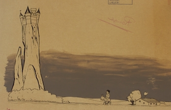See the Dutch description: Mannetje op ezel op weg naar kasteel. Gepubliceerd in Kuifje weekblad 43, 1959. Met stempel. Op achterzijde donkere achtergrond met verf. Door tegen het licht te houden is dit zichtbaar. 24 x 34 cm