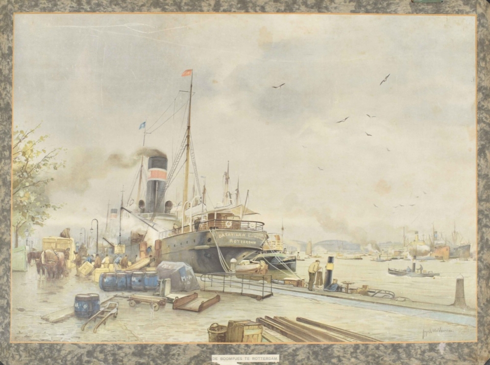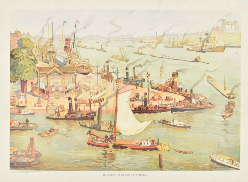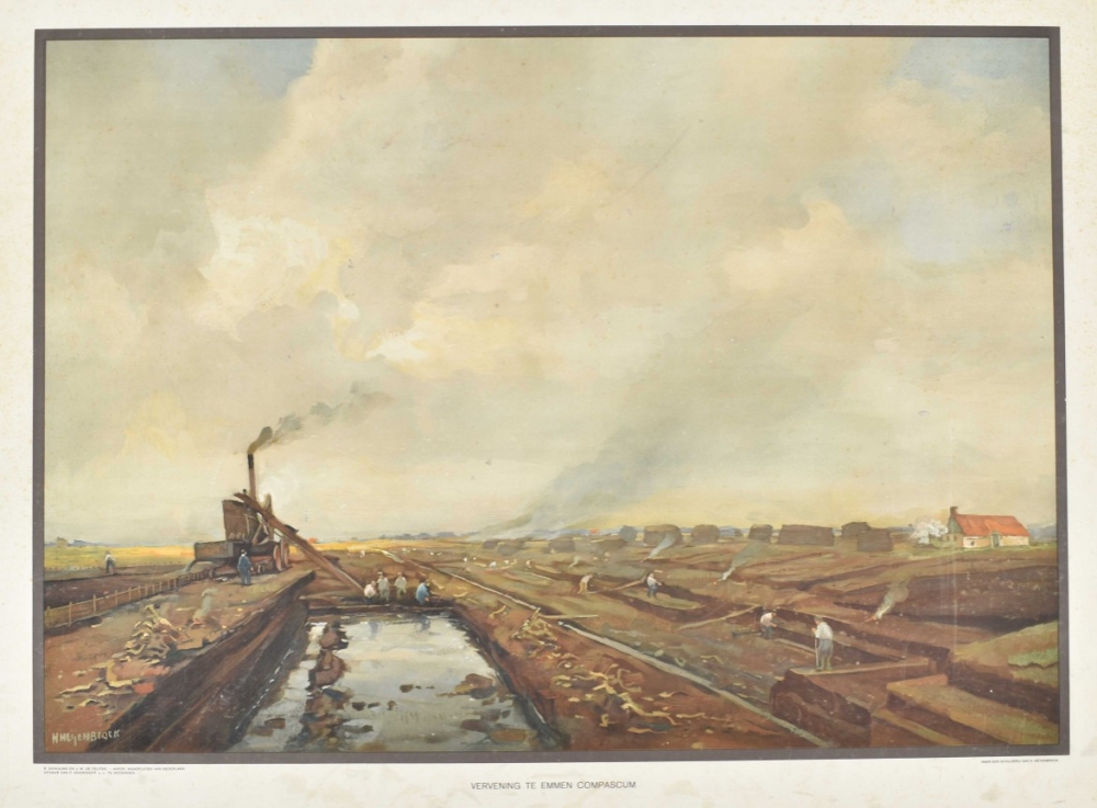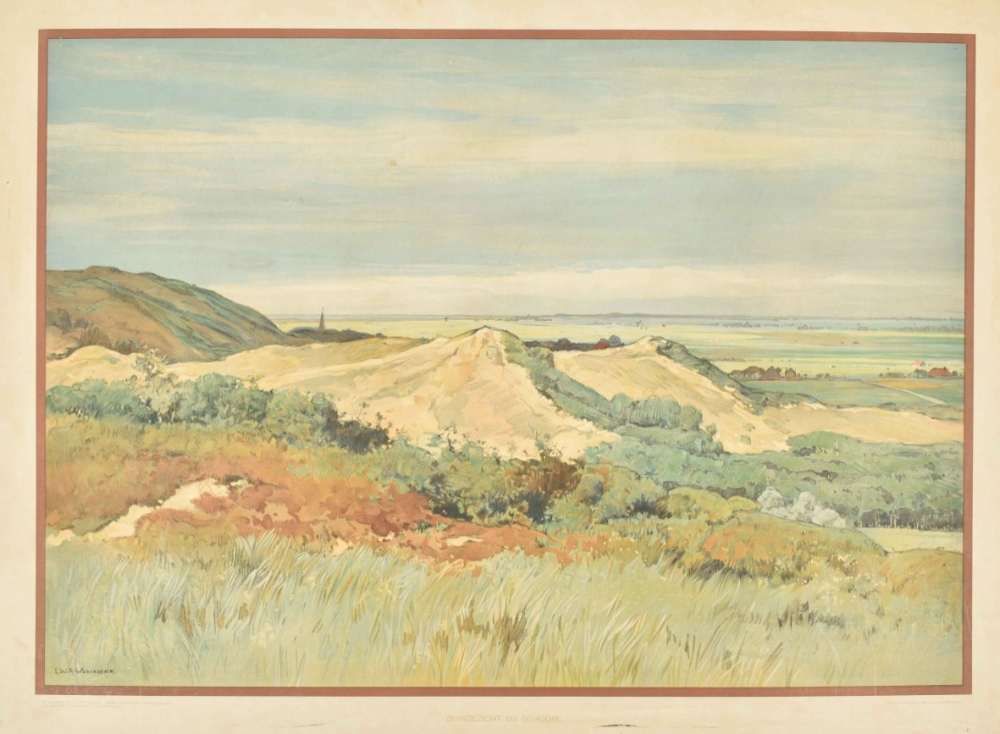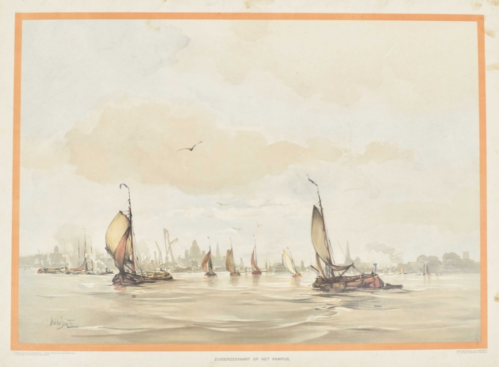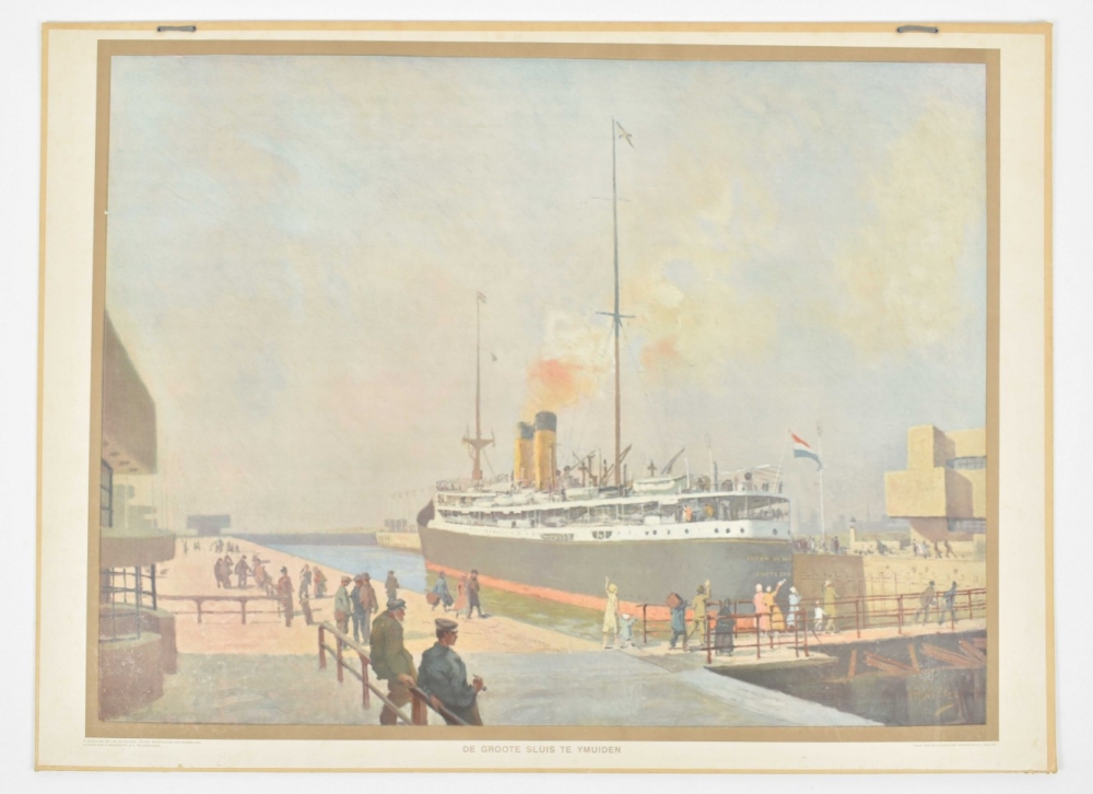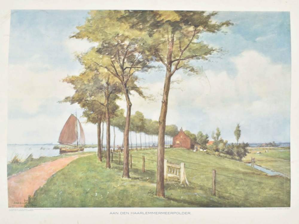 R. Schuiling and J.M. de Feijter. Groningen, P. Noordhoff, c. 1910-1935. 15 plates from this series (incl. 2 doublettes), including 'Aan de Haarlemmermeerpolder', 'Zuiderzeevaart op het Pampus' and 'Beeklandschap bij Winterswijk'. 109 x 83 and 115 x 85 cm. Scenes based on paintings and aquarels by Dutch artists like P. van der Hem, Jan Sluiters and Bernard van Beek. And 2 more.