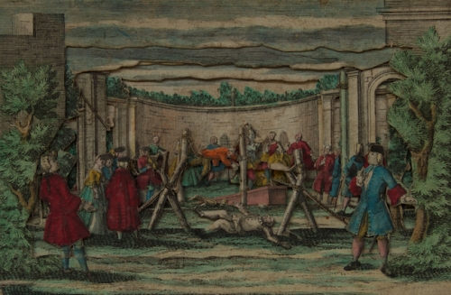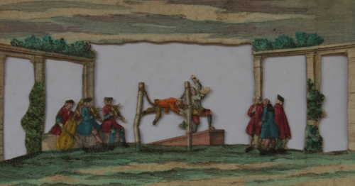 See the Dutch description: Eind 18de/ begin 19de eeuw, bestaande uit een gegraveerde handgekleurde achtergrond en 4 (van 5) lagen, in enveloppe uit de tijd.