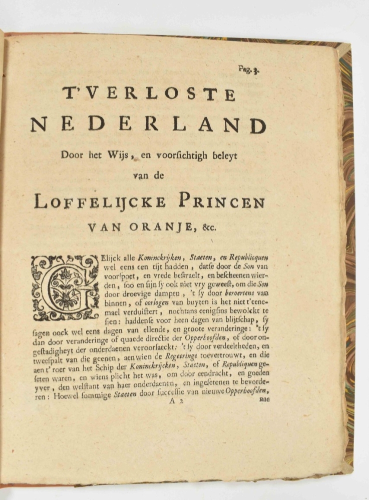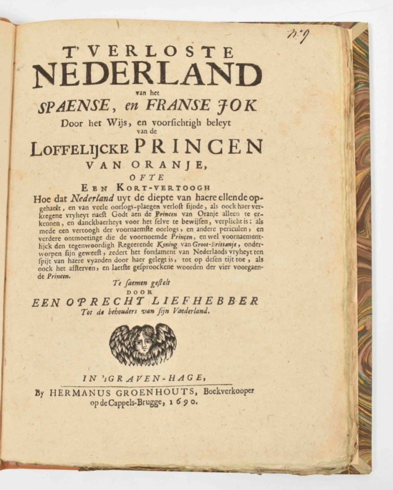 Door het wijs, en voorsichtigh beleyt van loffelijcke princen van Oranje, ofte een kort-vertoogh hoe dat Nederland uyt die diepte van haere ellende opgehaelt, en van veele oorlogs-plaegen verlost sijnde (...) en laetste gesproockene woorden der vier voorgaende princen. The Hague, Hermanus Groenhouts, 1690. 55 p. 4to. Modern hleather. Sm. woodcut title-p. vignette, initial and endpiece.