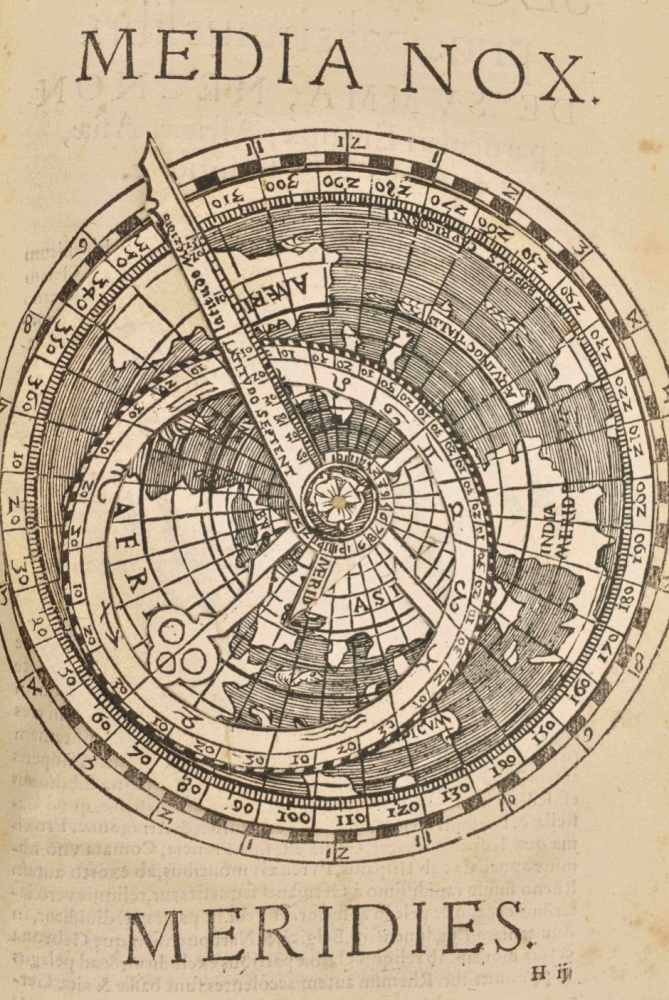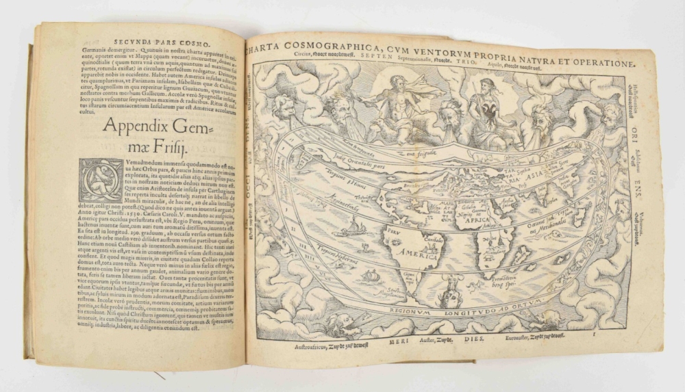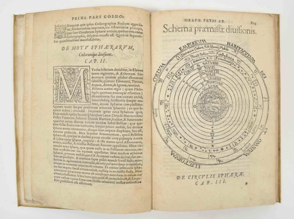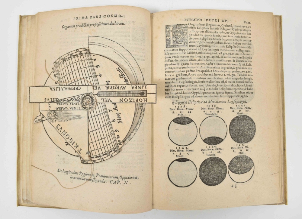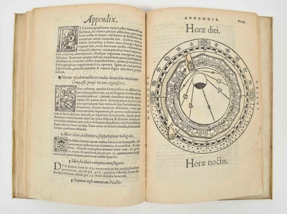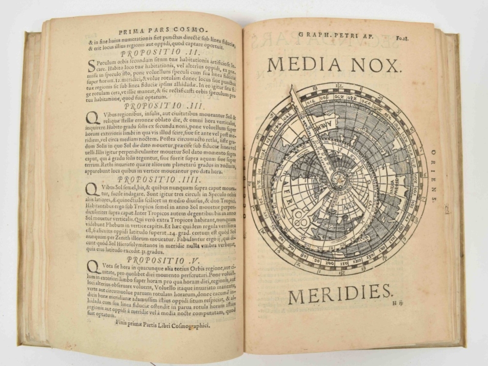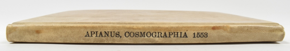 Petrus Apianus. Antwerp, Bontio, 1553. (2), 64, (2) fol. Large woodcut of the globe on title, profusely ills. with beautiful woodcuts in the text depicting diagrams of the solar system and the globe, 1 folding woodcut mappa mundi, and complete with the 4 four fully constructed and functioning volvelles. Rebound in later overlapping vellum with 20th-century pressed title on spine, renewed endpapers, large 4to.