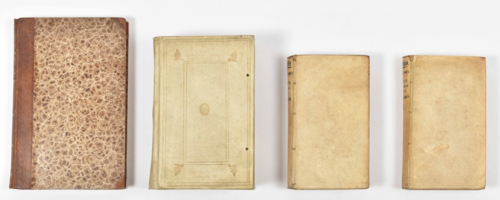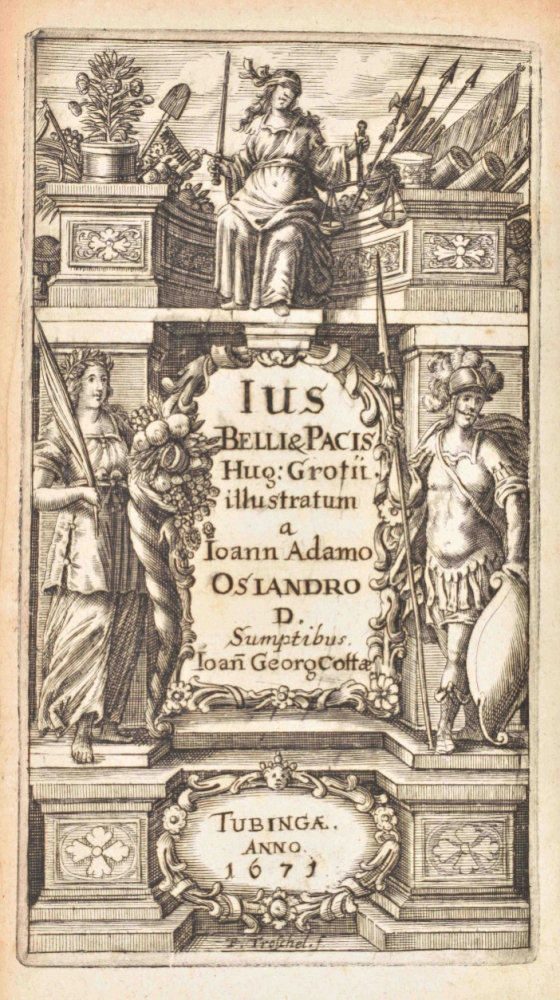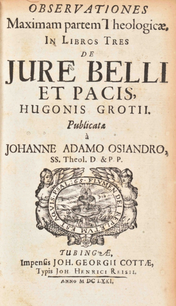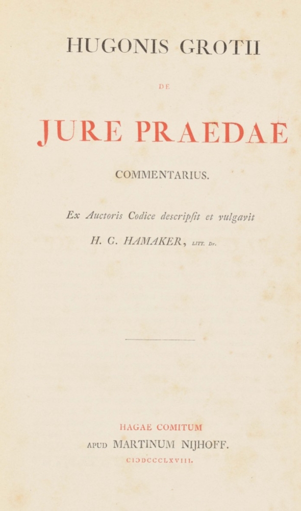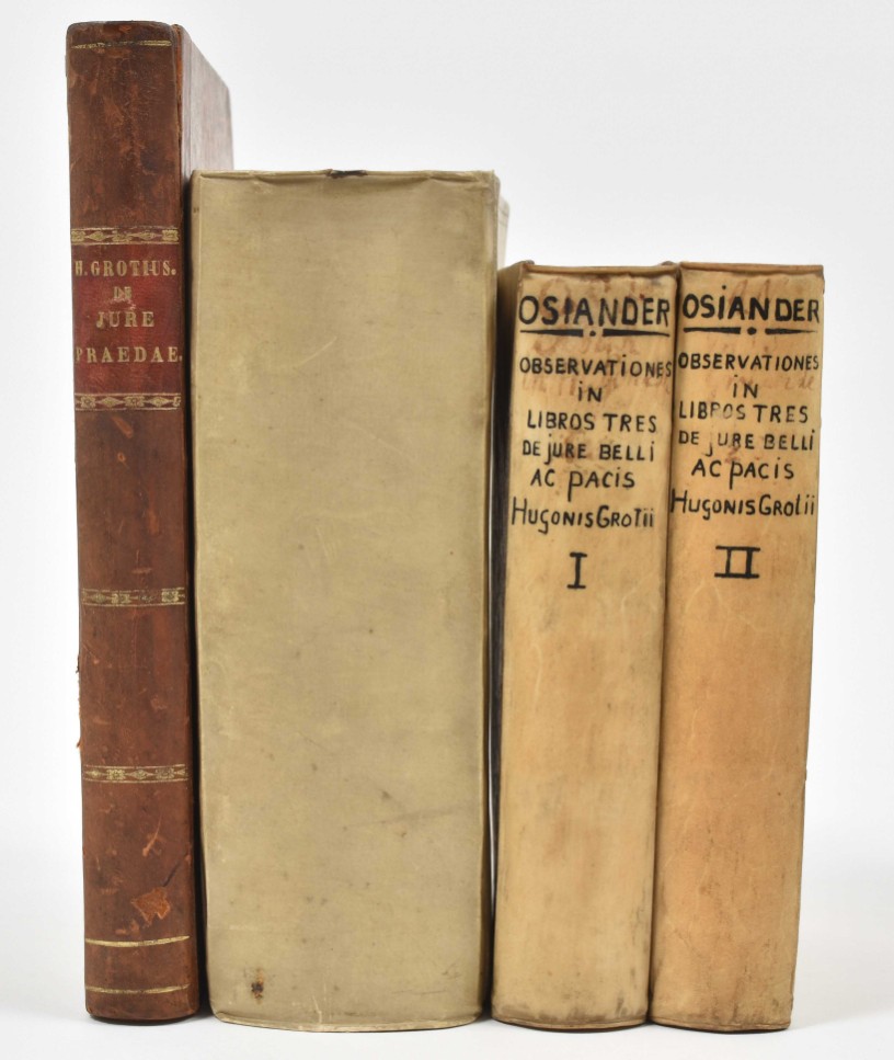 Lacks ties, else a very fine and attractively bound copy. Ter Meulen & Diermanse, B.G., 605; Ledeboer p. 166 & 174. This edition with the annotations by Tesmarus, Obrechts and Barbeyrac; (2) Hugonis Grotii De jure praedae commentarius. Ex auctoris descripsit et vulgavit H.G. Hamaker (...). The Hague, M. Nijhoff, 1868, XVI,359 p., private half calf, gilt spine w. mor letterpiece, large 8vo. Sl. foxed/browned at the beginning and end from boards/turn-ins; upper joint split at top of spine. First edition. Ter Meulen & Diermanse, B.G., 684; PMM 125 (note); Fruin, Verspreide geschriften III, 367-445; (3) Observationes maximam partem theologicae in libroes tres De jure belli et pacis, Hugonis Grotii. Publicatae à Johanne Adamo Osiandro (...). Tübingen, printed by J.H. Reis for J.G. Cotta, 1771, 2 (of 3) vols., (14),480; 481-1024 p., w. engr. frontisp., contemp. unif vellum. w. later title in pen on spines, sm. 8vo. Lacks the third volume. With bookplate of H.P. Schaap on both upper pastedowns. Very rare. (total 3)