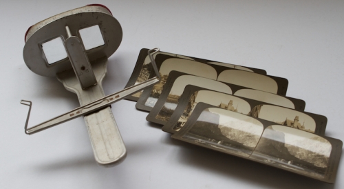 This item contains no English description. See the Dutch description: Ca. 1925. Aluminium kijker. Met 37 stereofoto's, met diverse foto's, o.a. China en Japan.