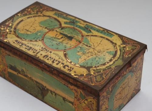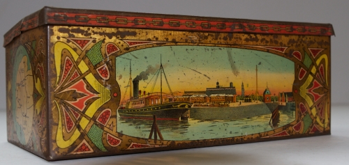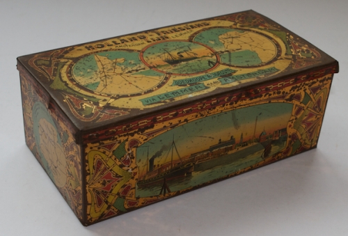 See the Dutch description: Blik Holland-Friesland Lijn, Amsterdam-Lemmer. Gelithografeerd blik, ca. 1900. 22 x 11,5 x 8,5 cm. Met voorstellingen aan alle zijden en Jugendstilmotieven aan buitenzijde. Wat slijtage en roestplekjes, vrij goed exemplaar.