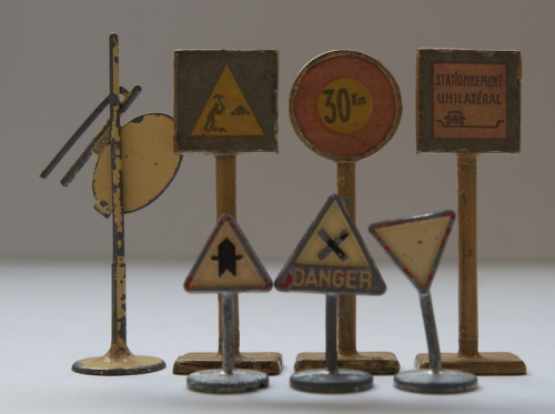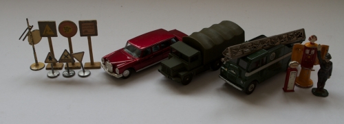See the Dutch description: Camion Militaire "Gazelle" Berliet, nr. 824 in doos. + Dinky Supertoys - B.B.C. T.V. extending Mast Vehicle with windows. nr. 969 in doos + Mercedes Benz 600 + 9 diverse verkeersborden en een agent.