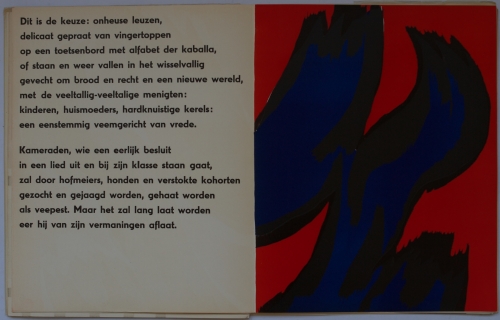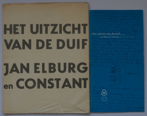 See the Dutch description: Galerie Le Canard, Amsterdam, 1952. In 9 dubbelp. vellen, met teksten van Elburg en houtsnedes van Constant. Gedrukt bij G.A. Verweij, Schiedam, oplage 125 ex. Dit is nr. 104, gesign. door de drukker. + Het Uitzicht van de Duif. Jan Elburg en Constant, een documentaire. Stedelijk Museum, Schiedam, 1998. 24 p.