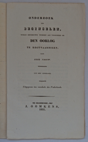 See the Dutch description: Uit het Engelsch. Uitgegeven ten voordeele des Vaderlands. Groningen, J. Oomkens, 1831. Papieren boekje, touwgebonden, 54 p. waarvan sommige ongesneden. De auteur van het boekje blijft onbekend, maar dat het om een vrouw gaat, is volgens de uitgever wel vermeldenswaardig.