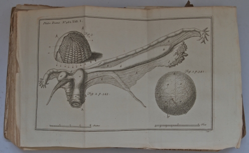 See the Dutch description: Philosophical Transactions, Giving some Account of the Present Undertakings, Studies, and Labours of the Ingenious, in many Considerable Parts of the World. Londen, C. Davis. Vol. 44, Part I, Numb. 478, 1747 + Numb. 493, 1751. Gebonden in harde kaft. Resp. 749, [66] + 684 pp (p. 189-873). En resp. 26 + 21 (uitvouwbare) illustraties.