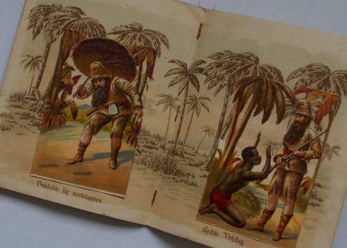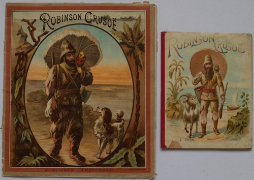 See the Dutch description: J. Vlieger, Amsterdam, ca. 1885. 16 p. 8vo, met 6 beweegbare chromolitho's. Klein hapje uit opgepl. voorplaat, ca. 1 cm., verder goed exemplaar. + Robinson Crusoë door Adelbert, J. Vlieger, Amsterdam, ca. 1885. 16 p. Met twaalf platen (steendruk). Los in geniete band, verder goed ex.