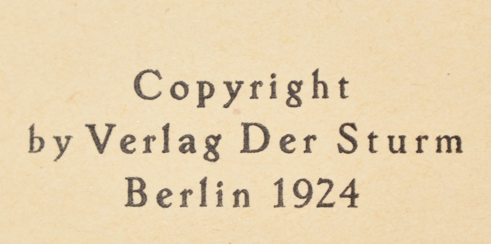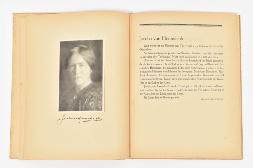 Introduction by Herwarth Walden, Marie Tak van Poortvliet, Rudolph Blümner and a poem 'Für Jacoba van Heemskerck by Lothar Schreyer.' Berlin, Der Sturm, 1924. With tipped-in frontispiece portrait, 7 original woodcuts and other illustrations. Large 8vo. Decorated half cloth.