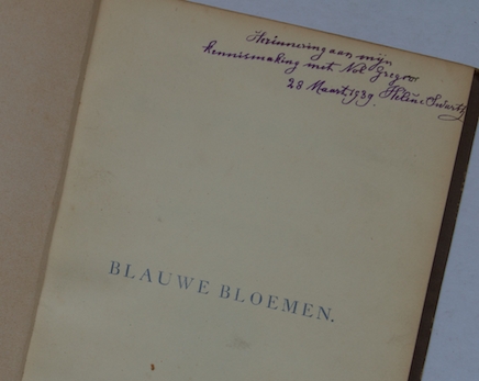 This item contains no English description. See the Dutch description: Blauwe Bloemen, J.L. Beijers, Utrecht, 1884. 142 p. Bijzonder exemplaar met opdracht "Herinnering aan mijn kennismaking met Nol Gregoor, 28 maart 1939". Rug gerest.