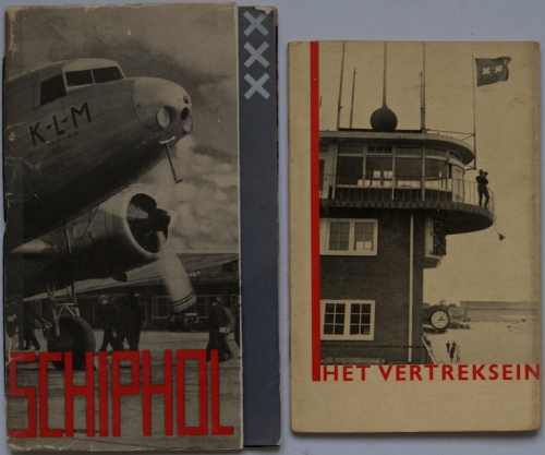 See the Dutch description: Schiphol, 64p. Kaft-ontwerp en binnenzijde-ontwerp Fré Cohen, geniet, verstevigd met touwbinding. + Schiphol, Gemeente-luchthaven van Amsterdam. Geïllustreerde gids. Binnenwerk en vouwomslag met doorkijkgat ontworpen door Fré Cohen. Uitgave van den dienst der gemeente handelsinrichtingen. Mooi ex., vouwvlak met Japans pap. verstevigd.
