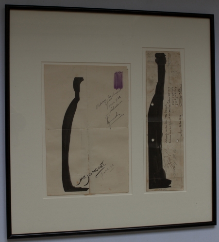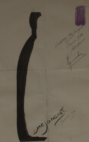 See the Dutch description: Origineel van twee flessenontwerpen. Tekening 1 - 27,5 x 19 cm., met datering en handtekening, juli 1922. Tekening 2 - 31,5 x 8,5 cm., met aantekeningen, en signatuur. Ontwerp voor de CP (Limonade en Likeur, Groningen) Literfles 1777, 1753 en 1754, Amsterdam, 15 october 1923.
