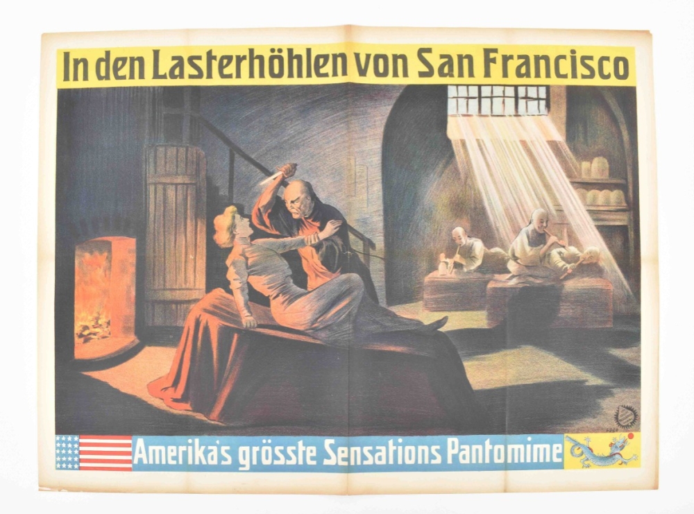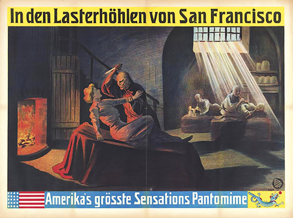 Amerika's grösste sensations pantomime. Portrayal of a Chinese opium den in urban San Franscico. Friedländer, Hamburg, 1909. 71 x 96 cm. Lith. no. 4984.