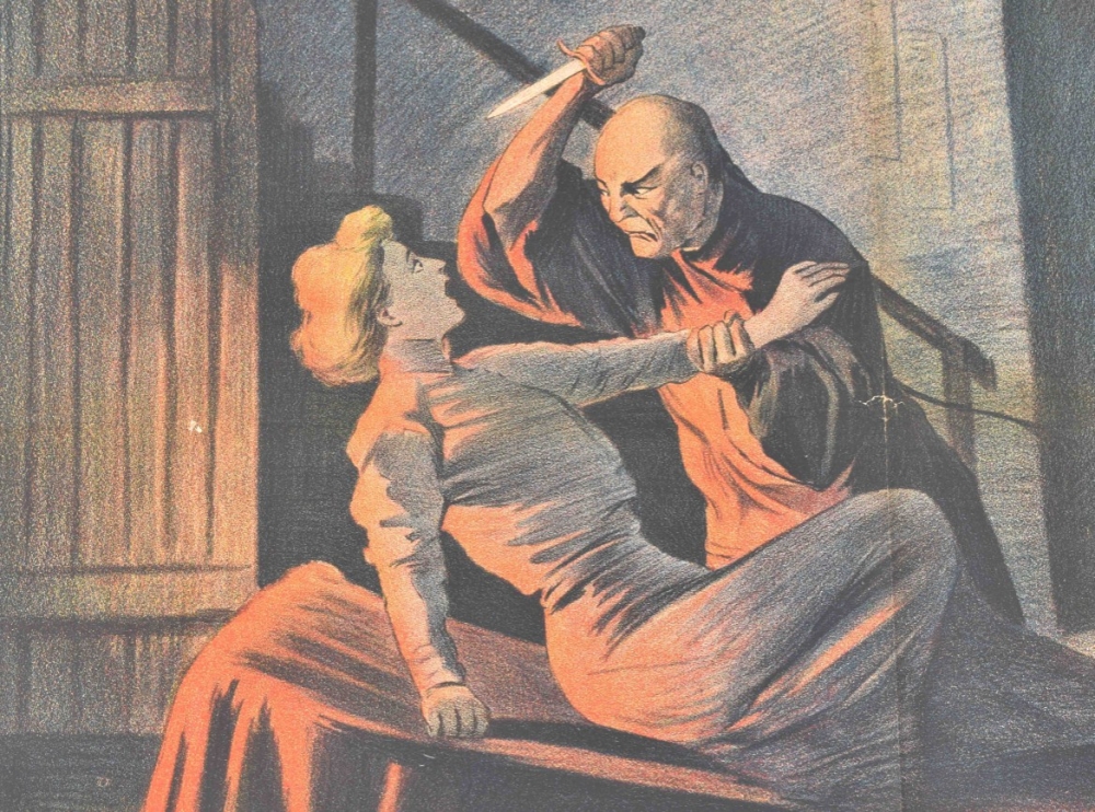 *The image of the attack, is also used in a second related poster which was created for the same play. In this poster, see lot no. 3298, it is incorporated in a very innocent scene of a wealthy woman holding a newspaper. Here it is depicted as the front cover.