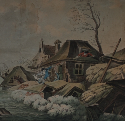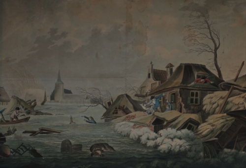 See the Dutch description: Aquatint. uitg. en tekenaar onbekend. Dramatisch tafereel met mensen die dreigen te verdrinken. 40 x 54 cm