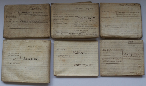 See the Dutch description: Tussen ca. 1650 en 1850, alle Engels, omgeving Sussex, Kent etc. mbt. mortgages, nalatenschappen etc. Veelal met gekaligrafeerde kapitels, zegels, enkele in 3 tot 6 perkamenten bladen.