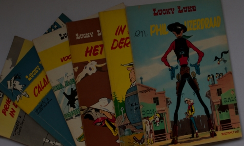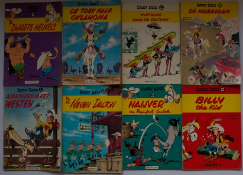 See the Dutch description: Dupuis. 18 Nummers uit de reeks, waarvan 13 in eerste druk, meest in redelijk goede tot goede conditie. O.a. "het escorte", dl. 28, 1966, "in de schaduw der boortorens", dl. 18, 1962 en "de karavaan", dl. 24, 1964.