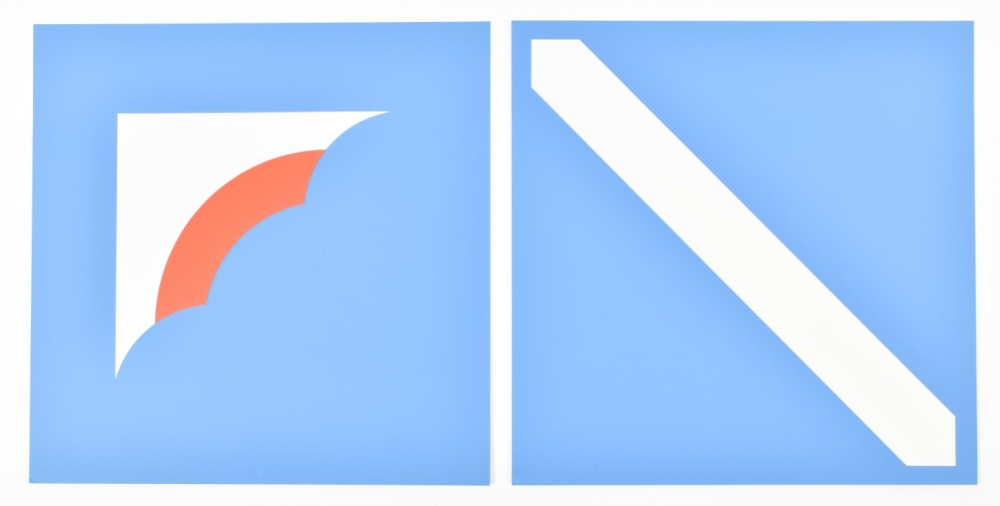 Decorated slipcase containing card sleeve, housing 27 loose leaves, 27 x 27 cm. Includes 4 original silkscreens in blue and red by Ellsworth, Bonies, Pfahler and Turnbull. Edition of 2200 copies. Minor rubbing on slipcase, card sleeve has 2 tears on the spine. Silkscreens and sheets very good. Added is the invitation card for the exhibition.
