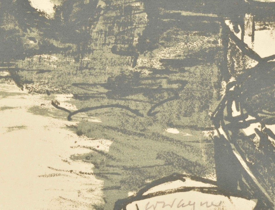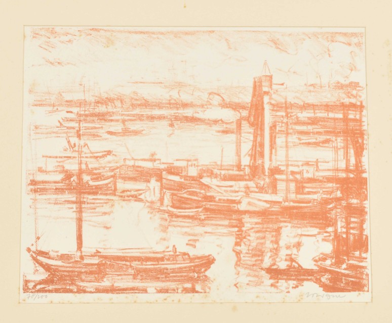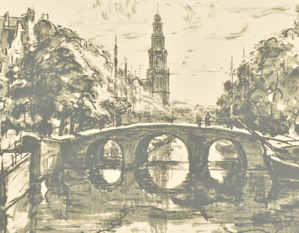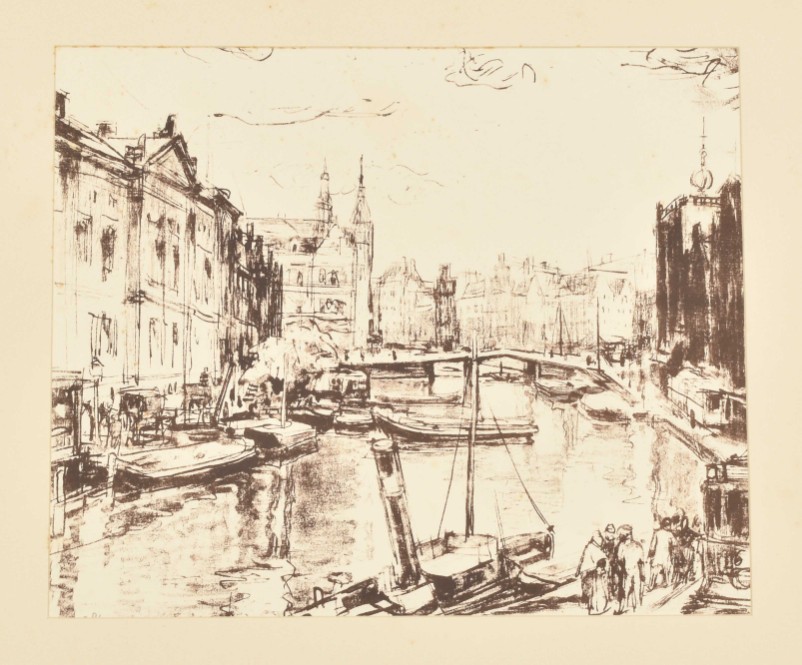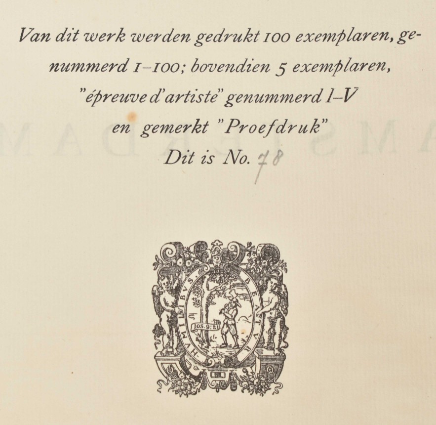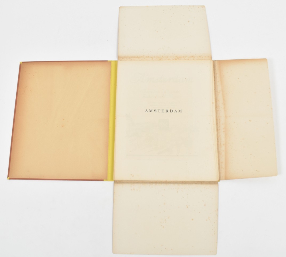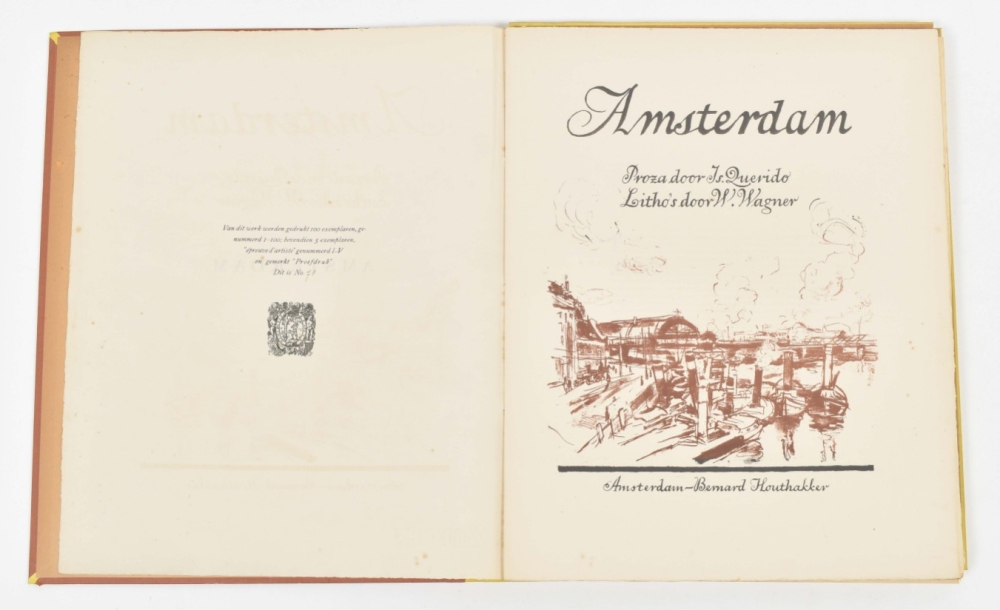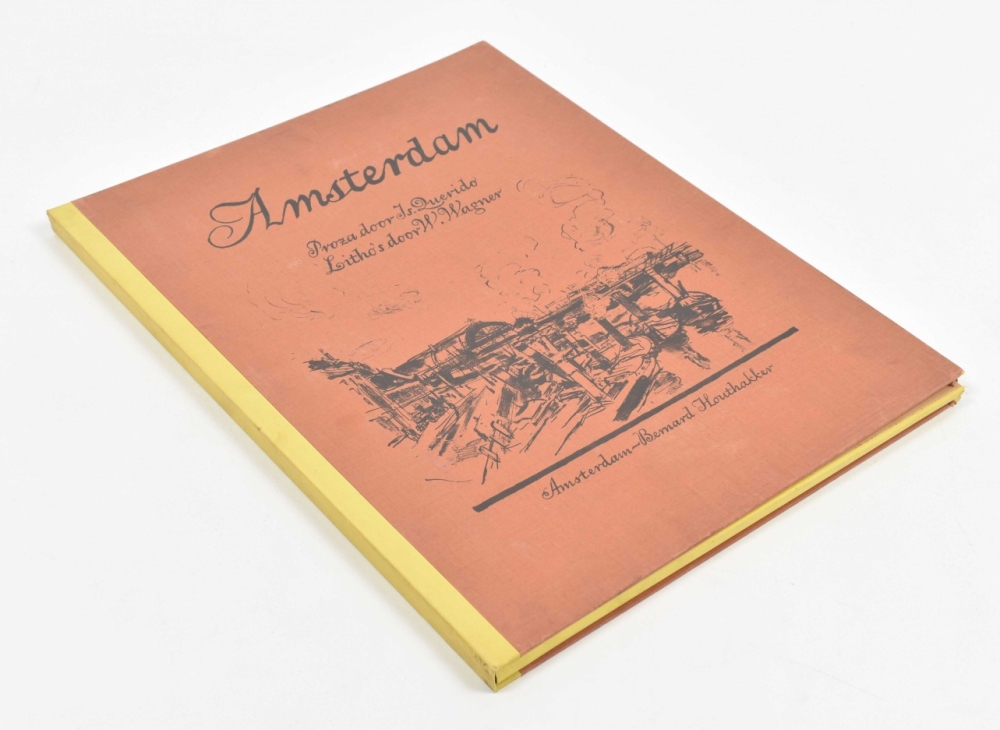 Amsterdam, Bernard Houthakker, (1921). Portfolio with lithographs by Wilhelm Wagner. 15 p., numbered in colophon with 1 lithograph depicting Central Station and 8 loosely inserted lithographs in colour, under passe-partout, each signed and numbered 78/100 in pencil. Folio, 46 x 37 cm.