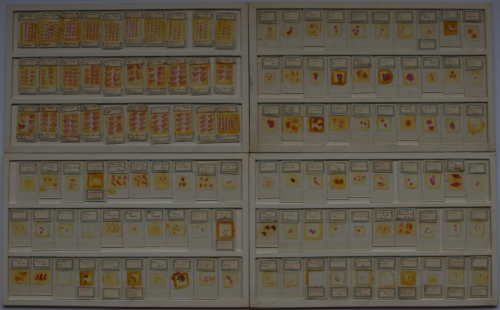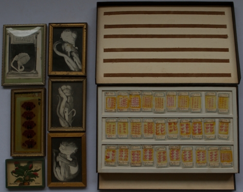 See the Dutch description: 7 Glasplaten in doos met daarin elk 30 preparaten + 3 foto's van een embryo van een chimpansee, ca. 1920 + een afbeelding achter glas van de Kartoffel-käfer. - en 2 andere.