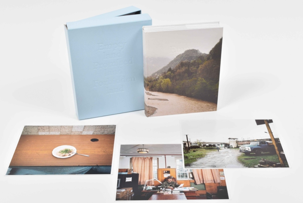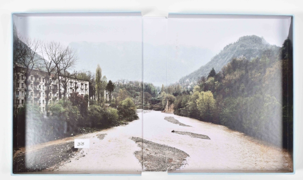 Empty land. Promised land. Forbidden land. The Sochi Project, 2010. 271, (1) p. An illustrated travel report through Abkhazia on the Black Sea. Dated '2010', signed by Hornstra and Van Bruggen on title-page. in blue embossed cardboard slipcase, illustrated and numbered '23/25' on the inside. Loosely inserted three C-Prints by Hornstra, 25.3 x 19.3 cm, signed and numbered on the reverse.