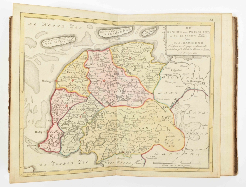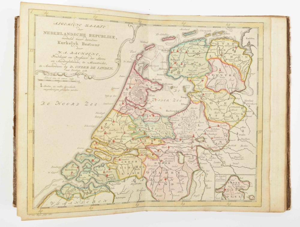 der Vereenigde Nederlanden. Als mede van de Landen der Generaliteit (...). Willem Albert Bachiene. Amsterdam, De Erven D. Onder de Linden en Zoon, 1794. Large 8vo (23.5 x 16.5 cm), title and 13 original handcoloured and folded maps (22 x 27 cm) by J. van Jagen, 1765-1771. Paper over boards partly missing. Fine copy.