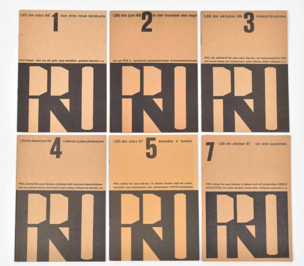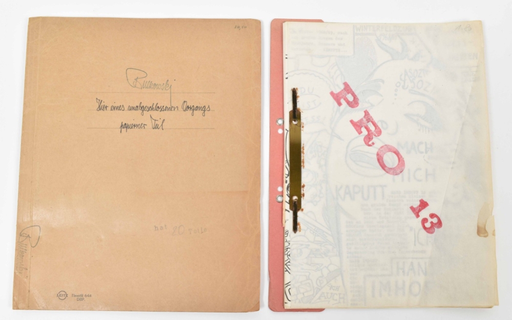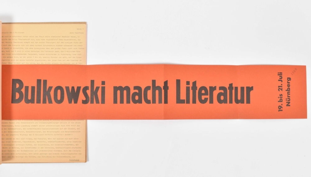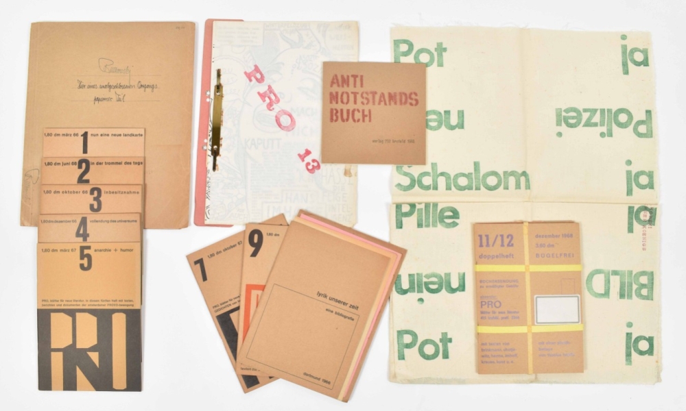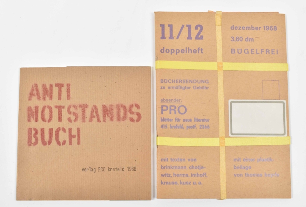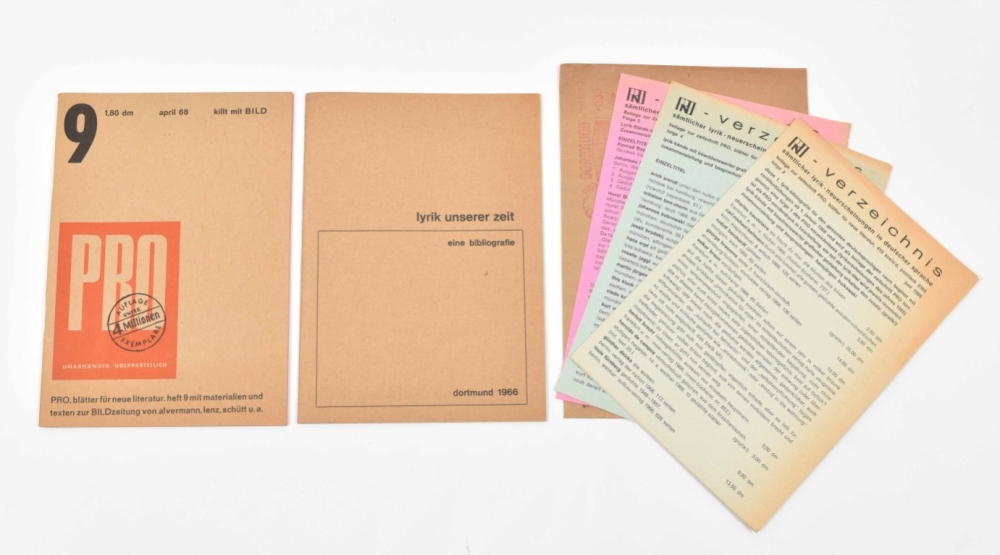 + Brown folder with handwritten and stamped title 'Bulkowski Hier eines unafgeschlossenen Vorgangs papierner Teil'. 22 stencilled sheets of various colours. Contains foldout, 70 x 12 cm, printed black on red paper titled 'Bulkowski macht literatur, 19 bis 21 juli Nurnberg 1968'. Some wear on folder, sheets good + 8 copies of PRO, blätter für neue literatur, produced by Bulkowski in Krefeld. Added are issues 1-5 and 7-9, 11/12, 13 and special edition 'Lyrik unserer zeit' (1966-68). Double issue 11/12 includes inserted colour silkscreens on transparent plastic sheet, a mint copy in original sending envelope addressed to Tjeerd Deelstra. (total 12)