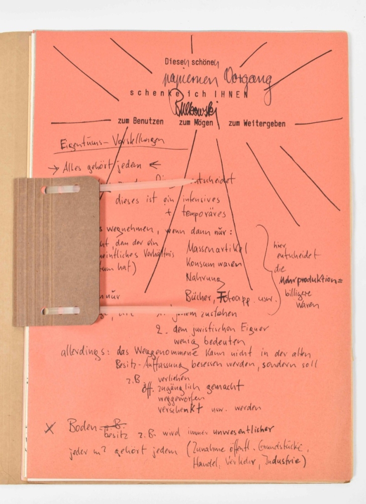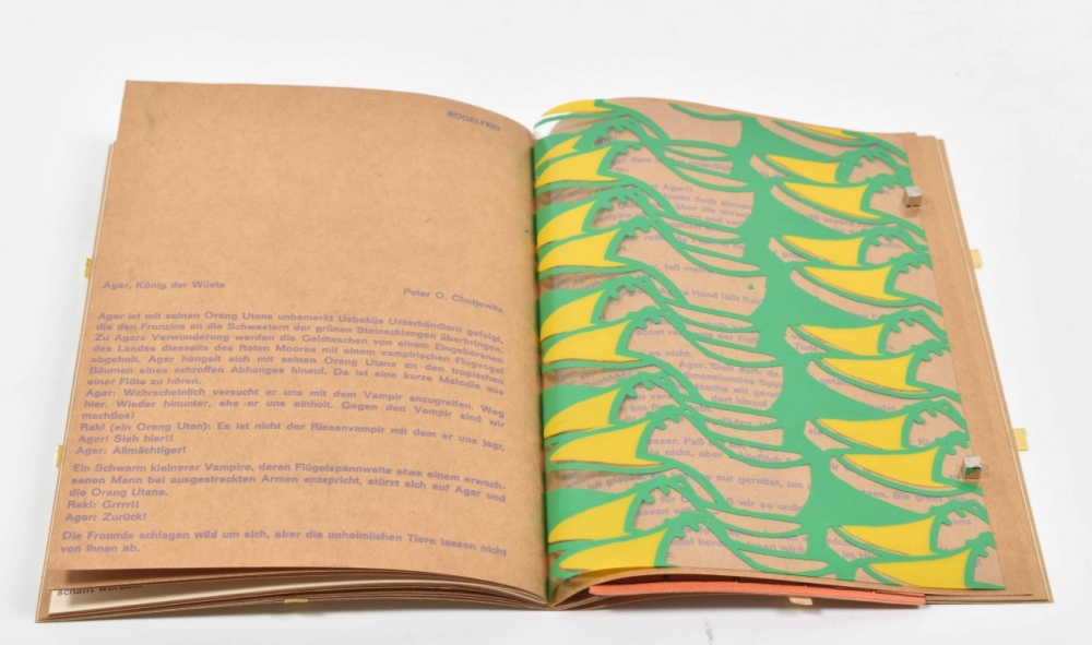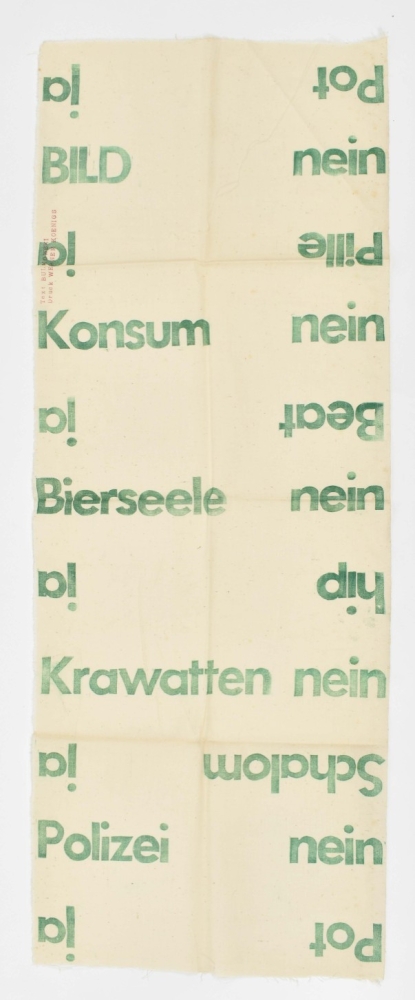 Varied lot of works by the German activist artist, writer, editor and publisher (b. 1938). Contains a silkscreened text piece on linen,102 x 40 cm, with words (Nein, Beat, Konsum, Polizei) printed in green. Colophon stamped along margin: Text Bulkowski, Druck Werner Koenigs, undated (1969) + Anti Notstands Buch. Krefeld, Pro Verlag, 1968. Hand numbered 9/30. Official state publication of the German Federal Republic Constitution, transformed into a multiple by the artist by adding a new title wrapper and stamped texts, 15 x 15 cm.