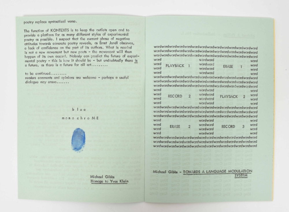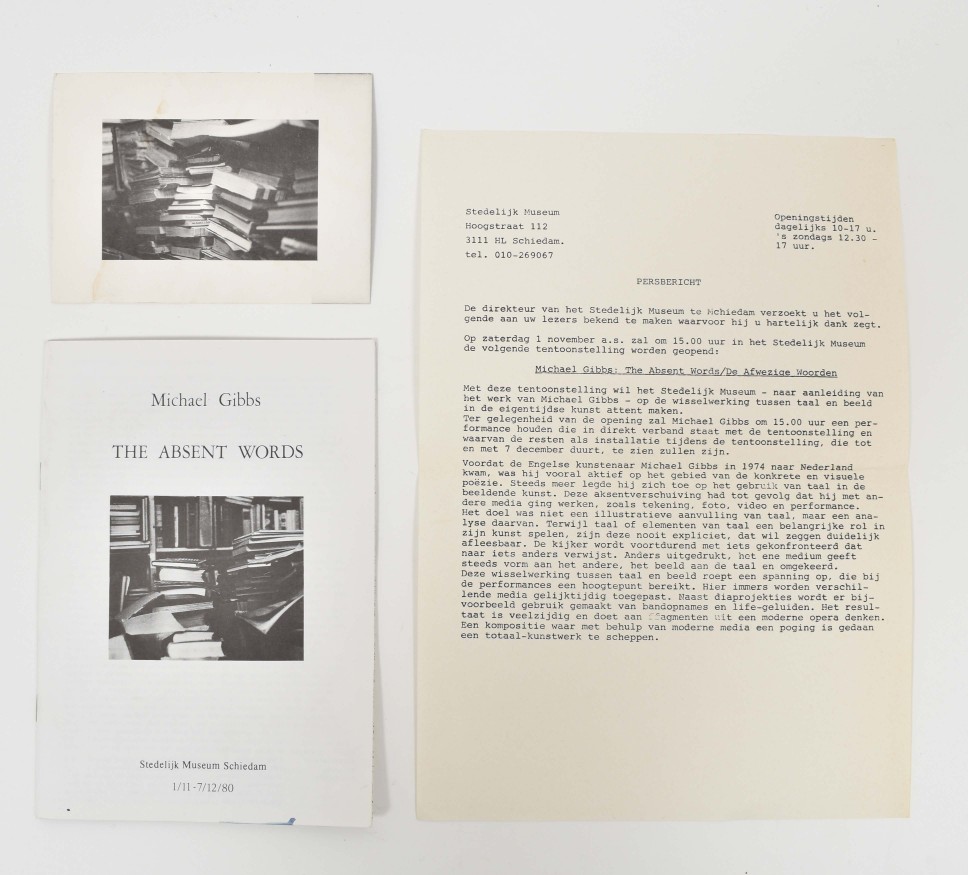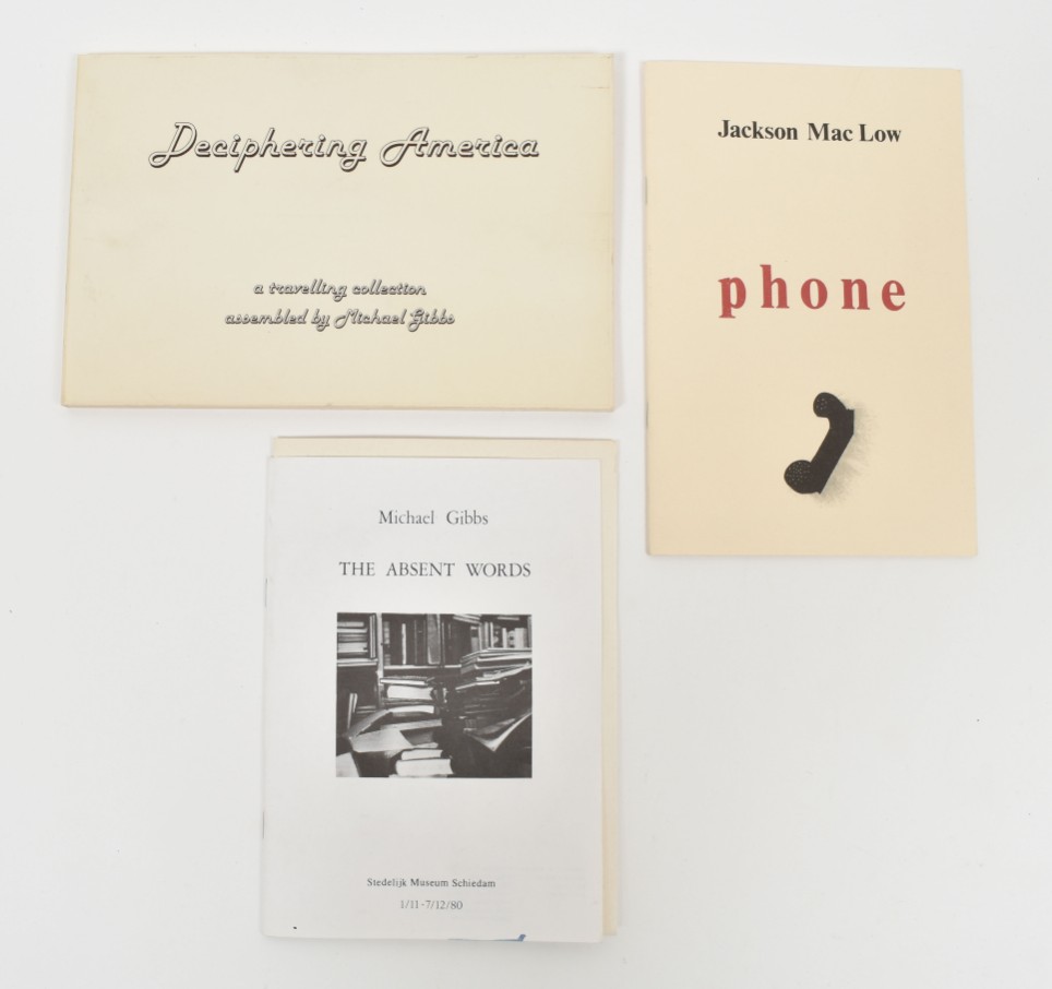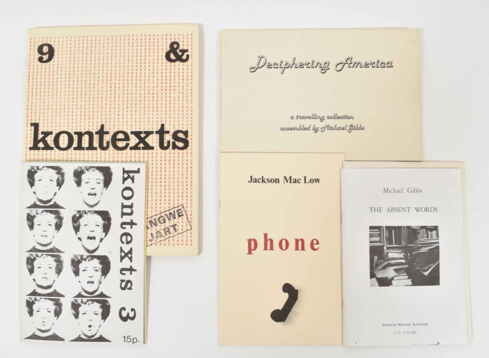 + Kontexts 8 & 9, Winter 76/77, edition of 500. Published in Amsterdam with co-editor Ulises Carrion. Contributions by Dick Higgins, Michael Druks, Ulises Carrion, Robin Crozier, Endre Tot, Jose Luis Castillejo et al. + Michael Gibbs, Decipher America, 1978, 120 pp. + Michael Gibbs, The Absent Words. Schiedam, Stedelijk Museum, 1980, 20 pp. (total 5)