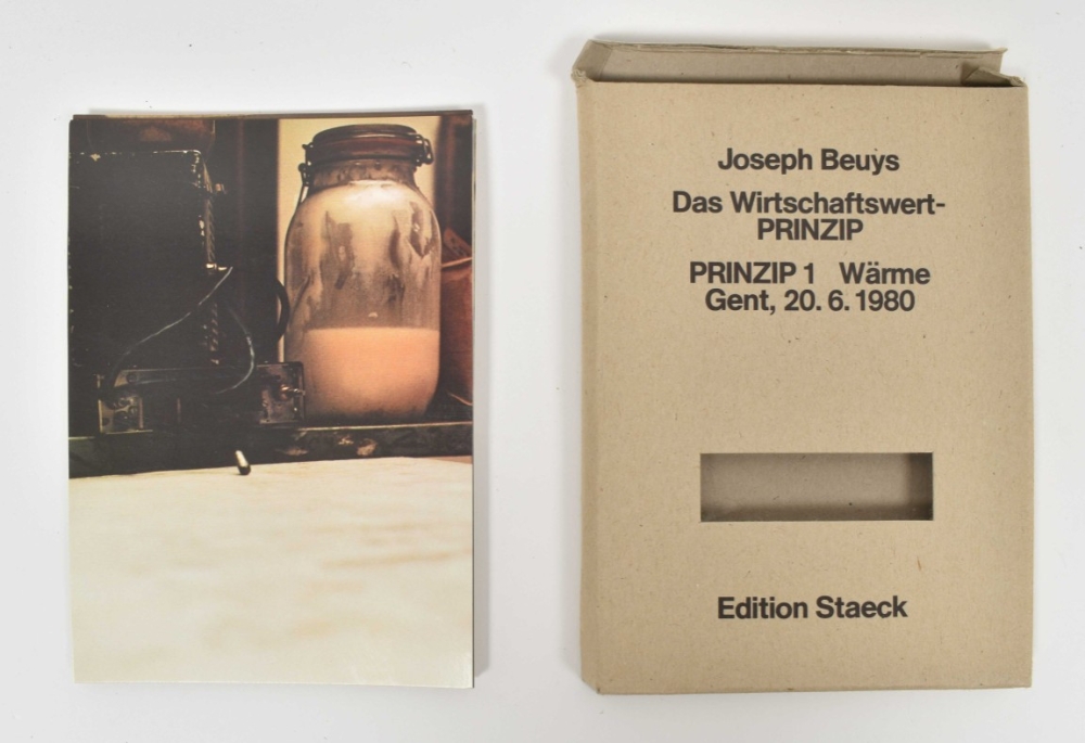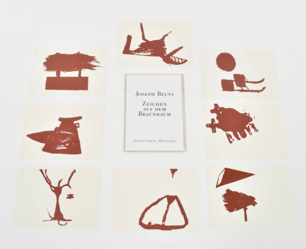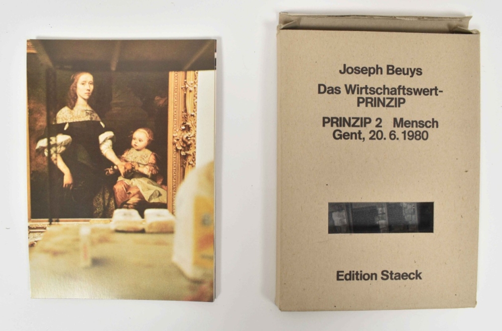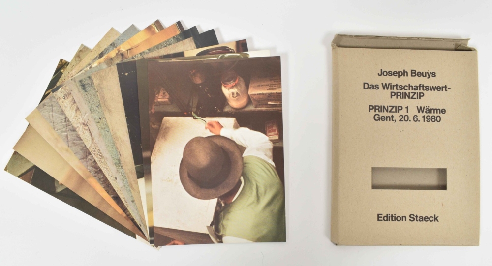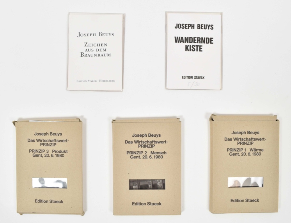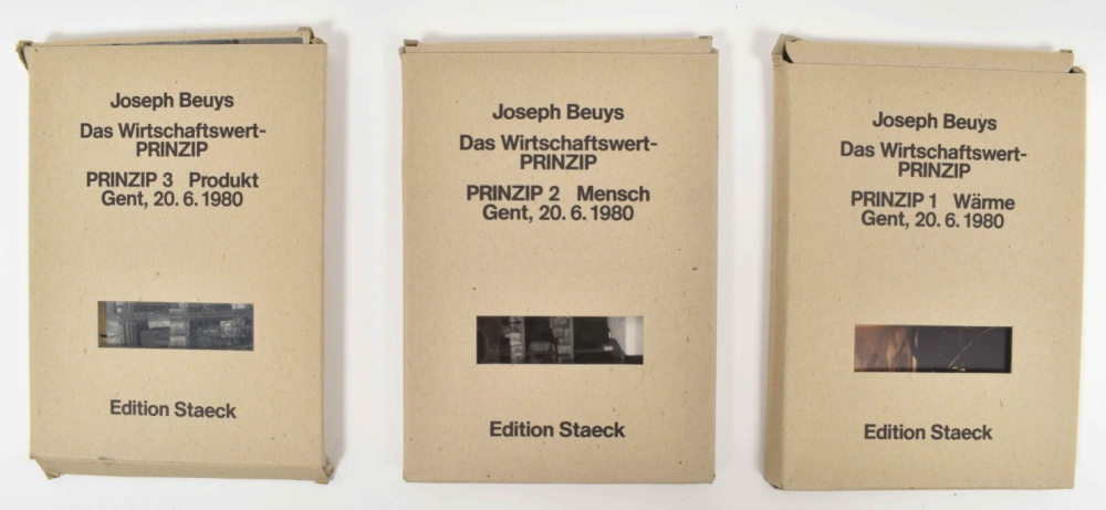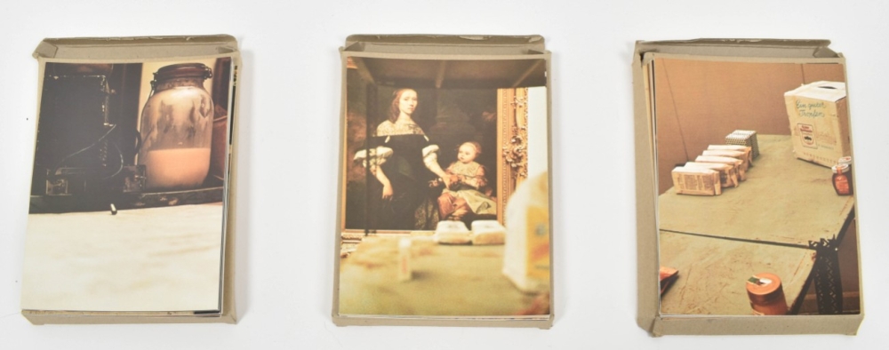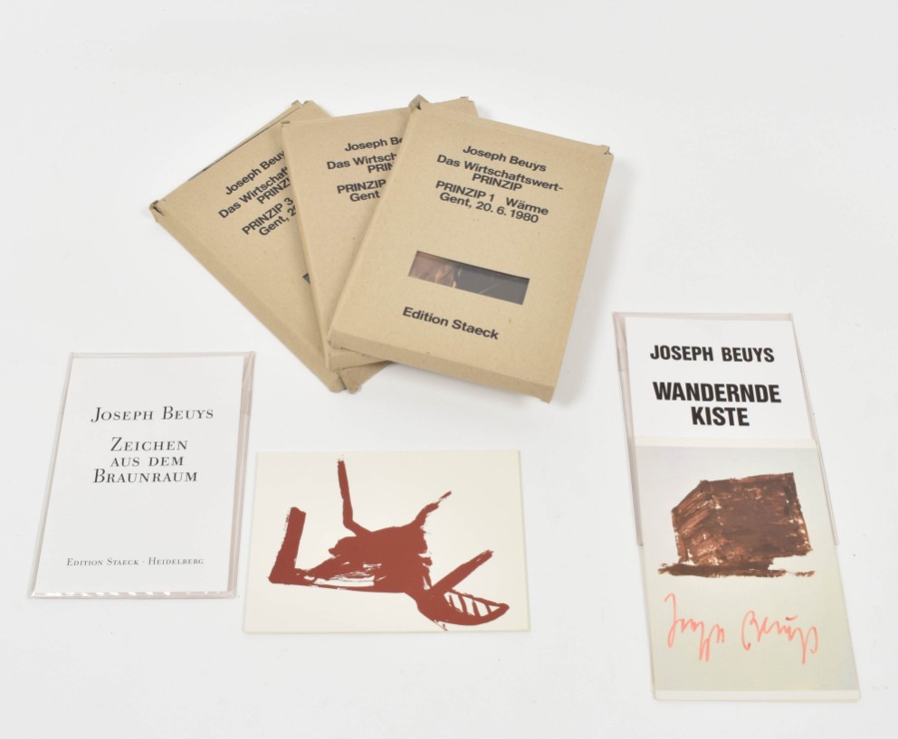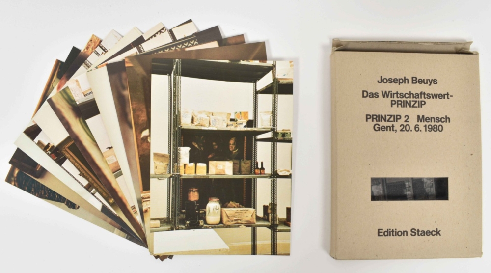 + Das Wirtschaftswert-PRINZIP. Prinzip 1 Wärme, Prinzip 2 Mensch, Prinzip 3 Produkt, 1981. Three cardboard boxes, 18 x 13 x 1.5 cm, some tearing at corners, with 34 colour postcards from the installation in Museum Gent, 1980. Added are 2 b/w snapshots of the exhibition + Zeichen aus dem Braunraum, 8 postcards with title card in clear plastic container, 15 x 11.5 cm, 1984. (total 5)