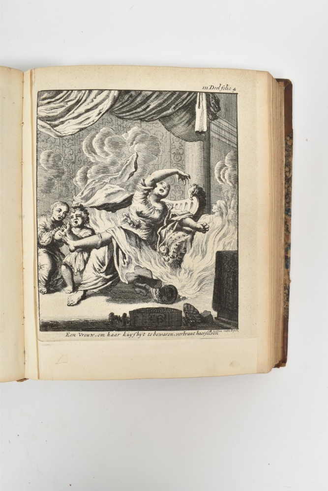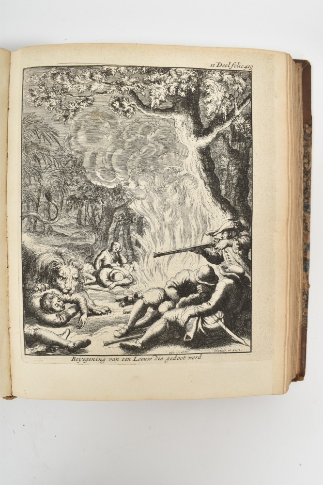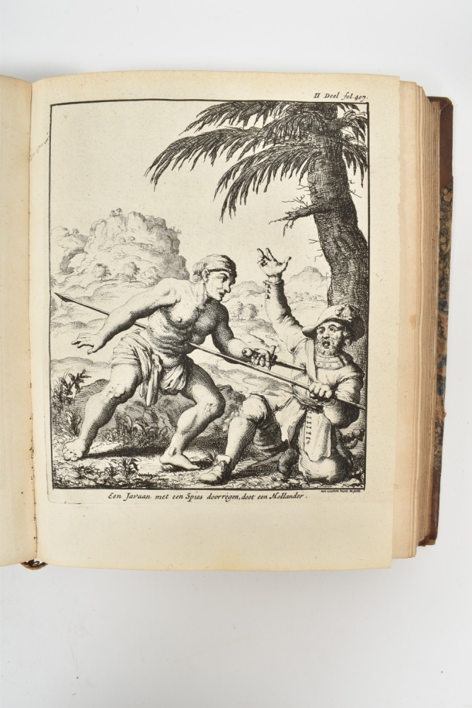 J. Glazemaker transl. Amsterdam, Johannes van Someren, 1682. 2 (of 3) parts in 1 vol. (4), 436, (4), 307 pp. Woodcut title vignette, 42 (folding) plates by Jan Luyken et al. and 2 folding maps, one depicting Japan and one showing the coastal regions of Tonquin. Half calf, raised spine with gilt title and vol. no., marbled boards, speckled edges.