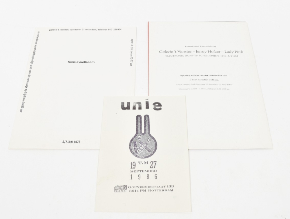 Circa 70 announcement cards and flyers from the 70s ad 80s. Includes a series of New York exhibitions, Jenny Holzer, George Condo, Hans Eykelboom.