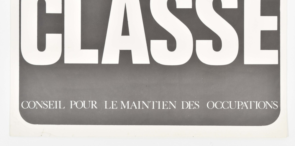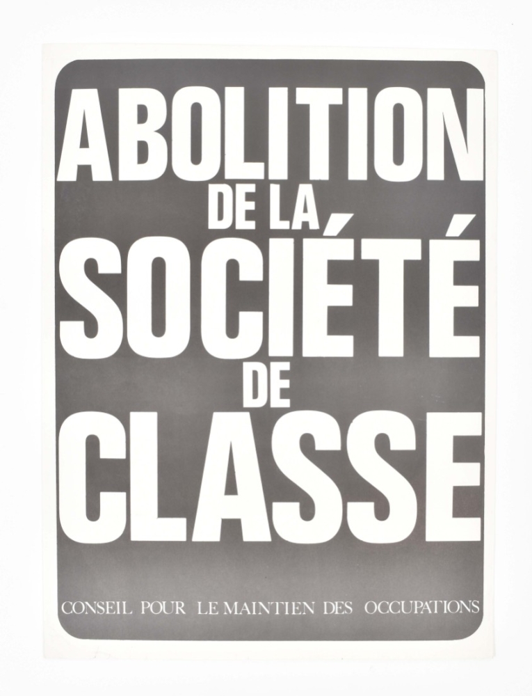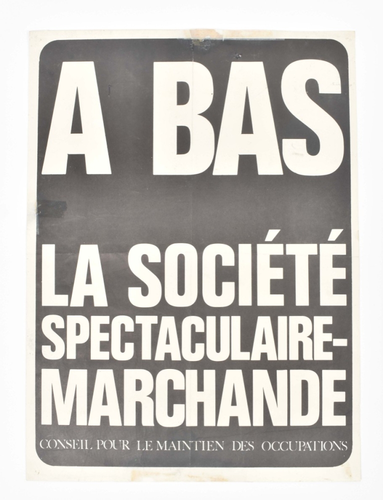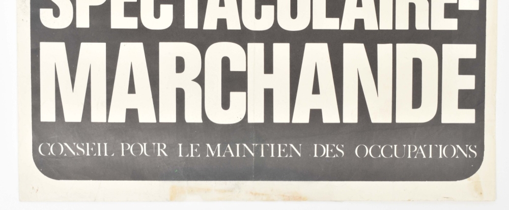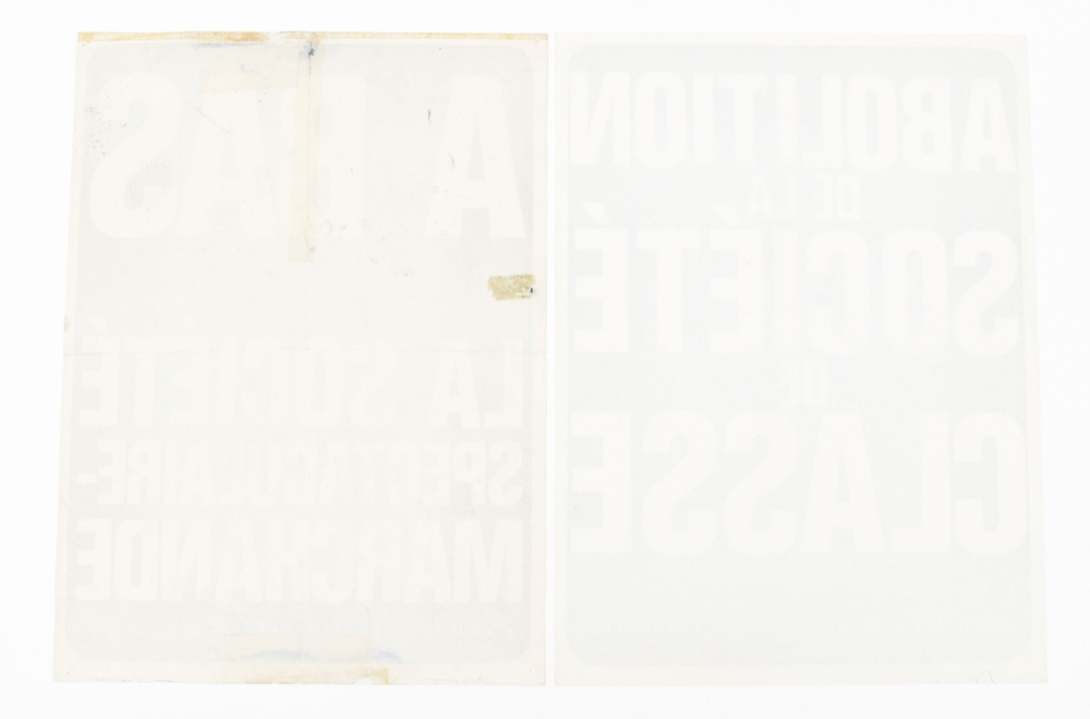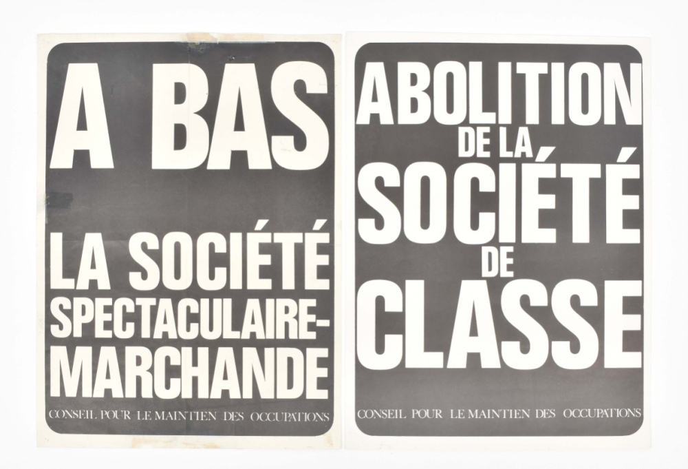 The messages on the posters read: 'A bas la Société Spectaculaire-Marchande/ Down with the Spectacle-Commodity Society' and 'Abolition de la Société de Classe/Abolition of Class Society'. The first poster was formerly folded and shows repaired sections and pinholes on corners. The latter poster is a fine unfolded copy, with a tiny abrasion on the lower left corner. (total 2)