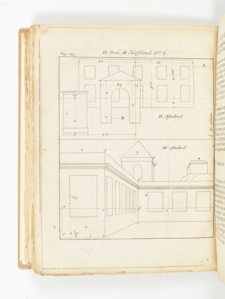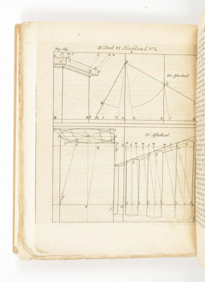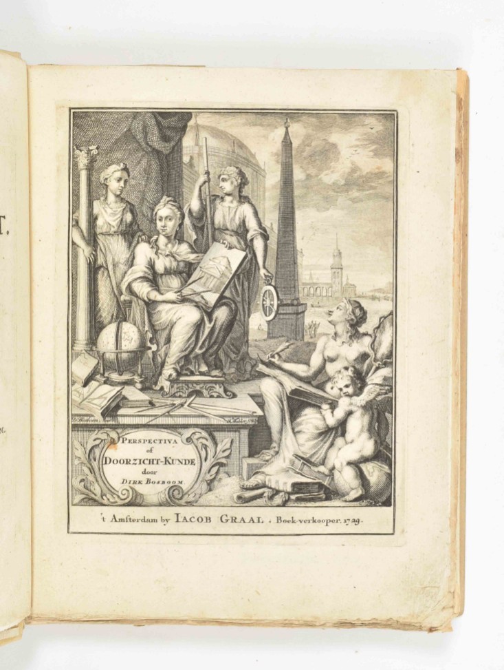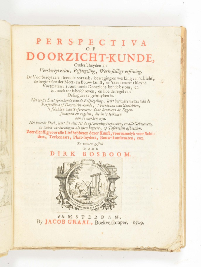 onderscheyden in voorbereytzelen, bespiegeling werk-stellige oeffening. De voorbereytzelen leert de oorzaak, bewegingen en werking van 't licht (...) en hoe de regel van Desargues te gebruyken is. Het eerste deel (...) leert het ware wezen van de perspectiva of doorzicht-kunde (...). Het tweede deel, leert dit alles tot de uytwerking toepaszen (...). Zeer dienstig (...) voornamelyk voor schilders, tekenaars, plaat-snyders, bouw-kunstenaren etc. Amst., J. Graal, 1729, (14),180 pp., w. engr. frontisp., title-vignette ("Konst doet meer als arbeid") and 18 plates. modern half vellum, 4to.