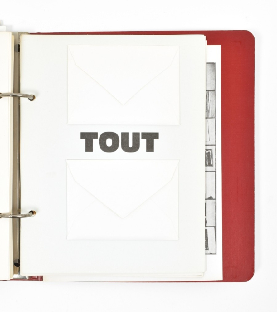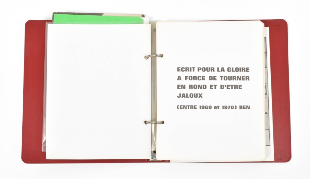 Nice, self-published, ca. 1970. Original black two-hole metal ring binder, 23 x 20 x 3.5 cm. Contains a collection of texts, reproduced drawings and photographs on 113 loose pages with perforation holes.