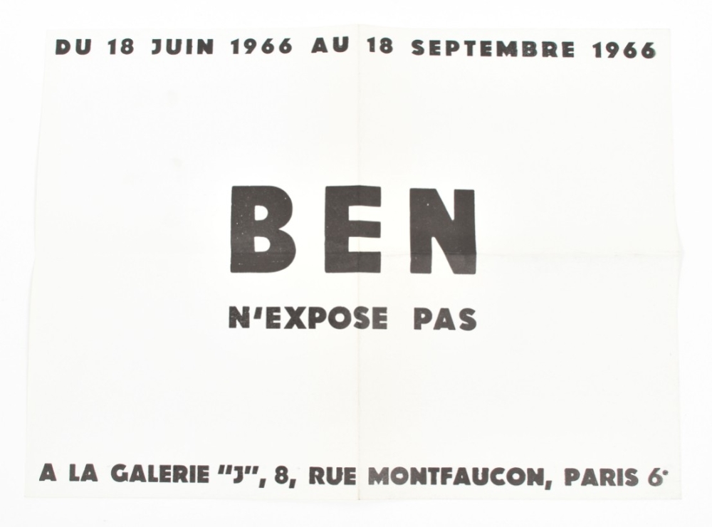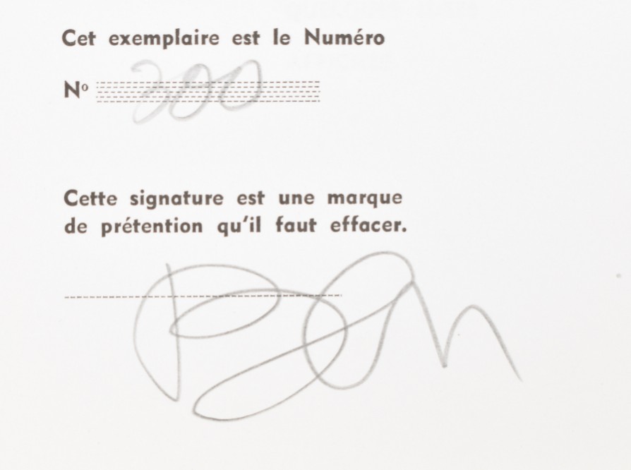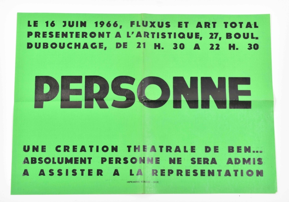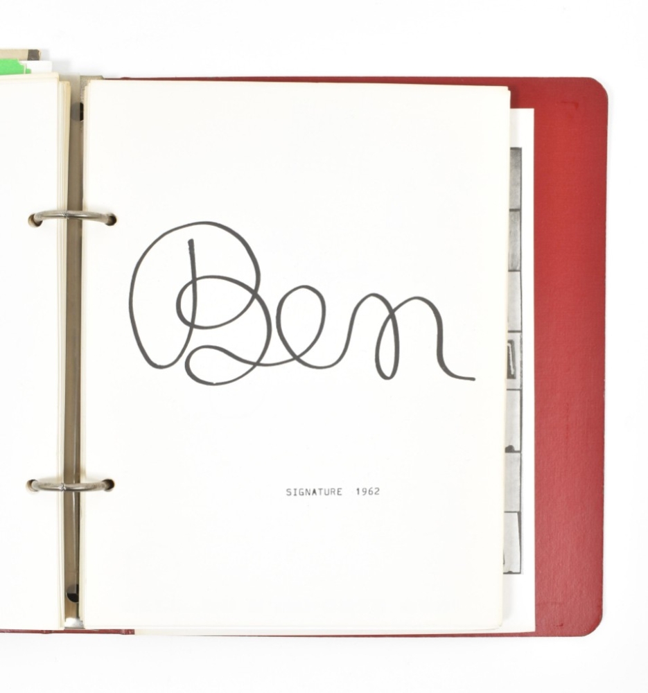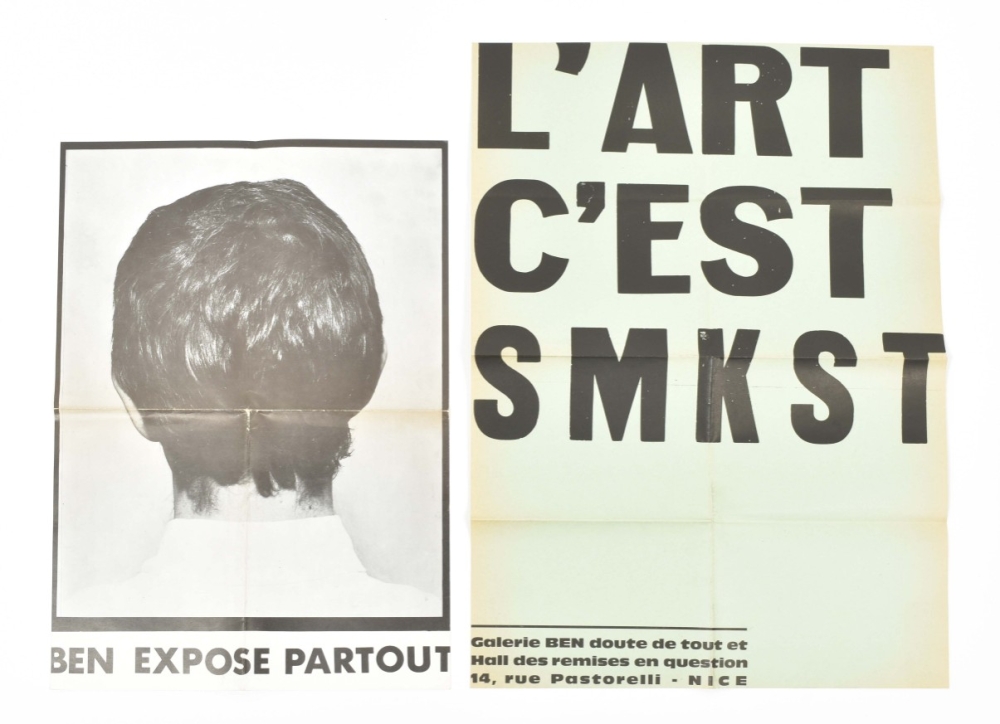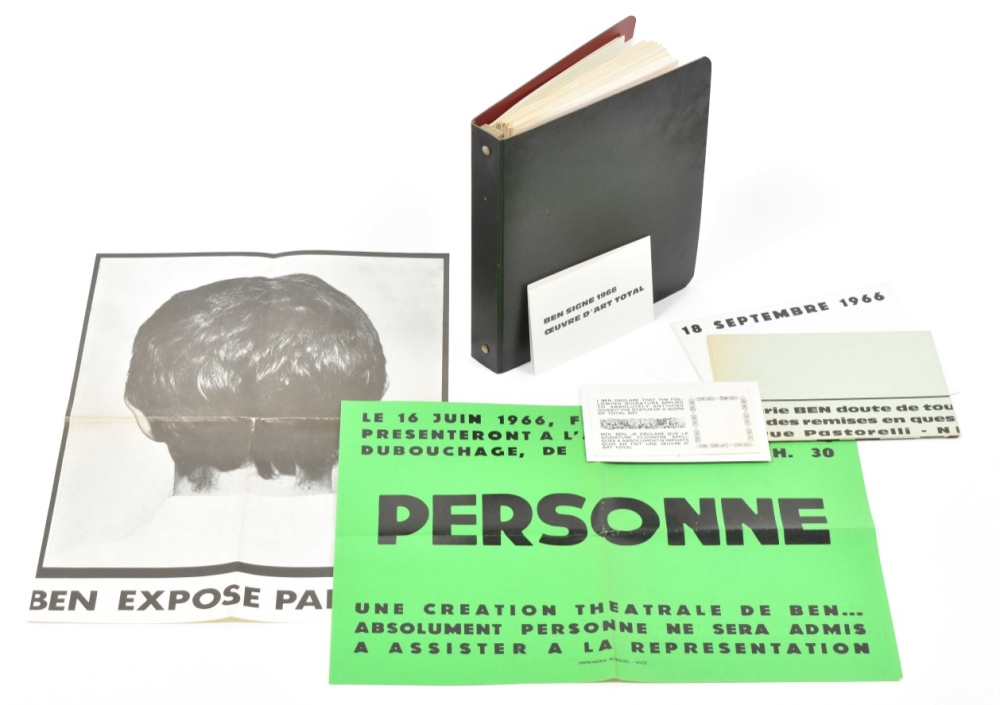 Features 3 plates with mounted envelopes with letterpress text by Ben, and a transparent plastic sleeve holding 4 folded posters and 3 printed cards by the artist. This copy is signed and numbered 300 in the colophon. From a print run of 751 copies, this is one of the 20 signed and numbered copies with the folding posters. Housed in the original cardboard sending box, 22.5 x 25.5 x 4 cm, hand-addressed to EJ van Straaten, sent by Ben Vautier from Nice. Very good copy.