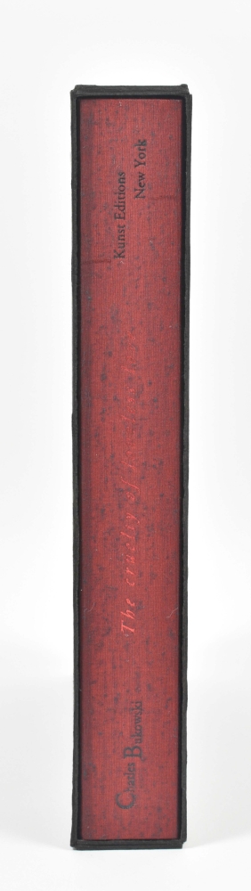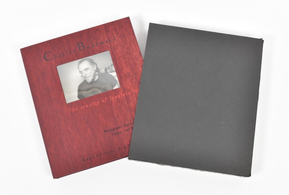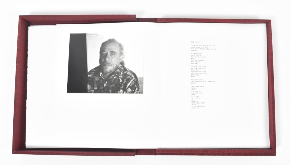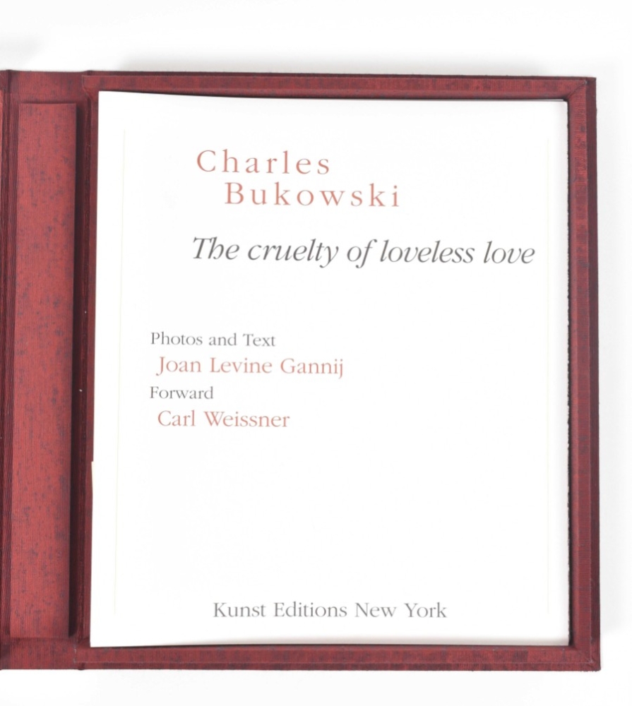 New York: Kunst Editions, 2001. First edition. Hard black slipcase housing a burgundy cloth clamshell box with photo inset to front cover. Contains 12 loose sheets, 37 x 32 x 5 cm. Deluxe limited edition of this collection of original tipped in black and white photographs of Charles Bukowski made by Joan Levine Gannij, accompanied by poems by Linda Lee and Bukowski.