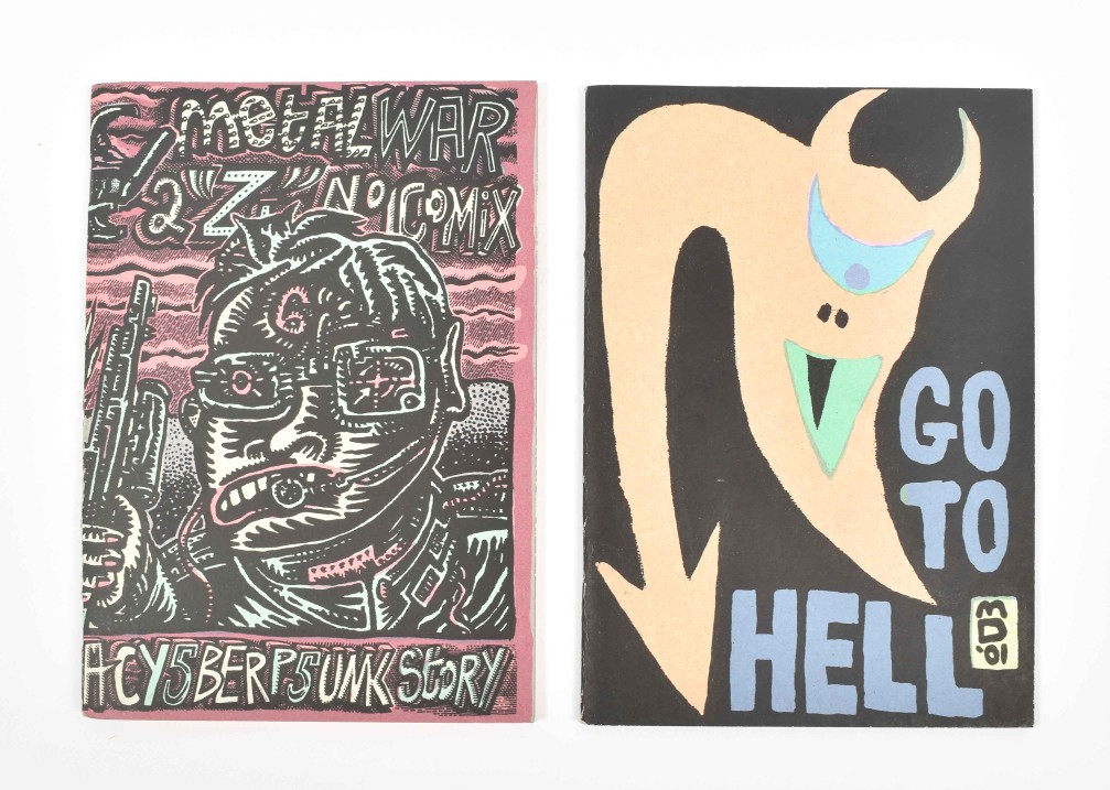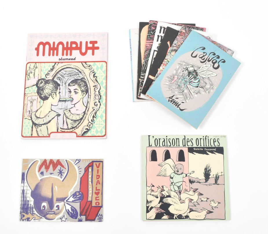 Includes: (1) Quentin Faucompré, L'oraison des orifices, 2003. 22 x 22 cm, ed. 200. Drawings with lots of genitals in weird places. (2) Miniput stumcad, 2003. 29.5 x 22 cm, ed. 500. (3) Pascal Doury, Kinky copy, Vida Loco, 2000. (4) Gerardo Monsirais, Pinche Pedo, 2003. ed 150. (5) Mike Diana, Go to Hell, 2003. ed 500. (6) Cyber Punk Metal War, 1998. (7) Machina Mundana: Esoteric Art of Marcel Ruijters, 2003. (8) Laurent Impeduglia, Outsider Cycle, 2004. ed 450. (9) Caroline Sury, Caroline et ses Amis, 2000. ed 500. (10) Remi, Cassos, 2001. ed 750. All books in fine state. (total 10)