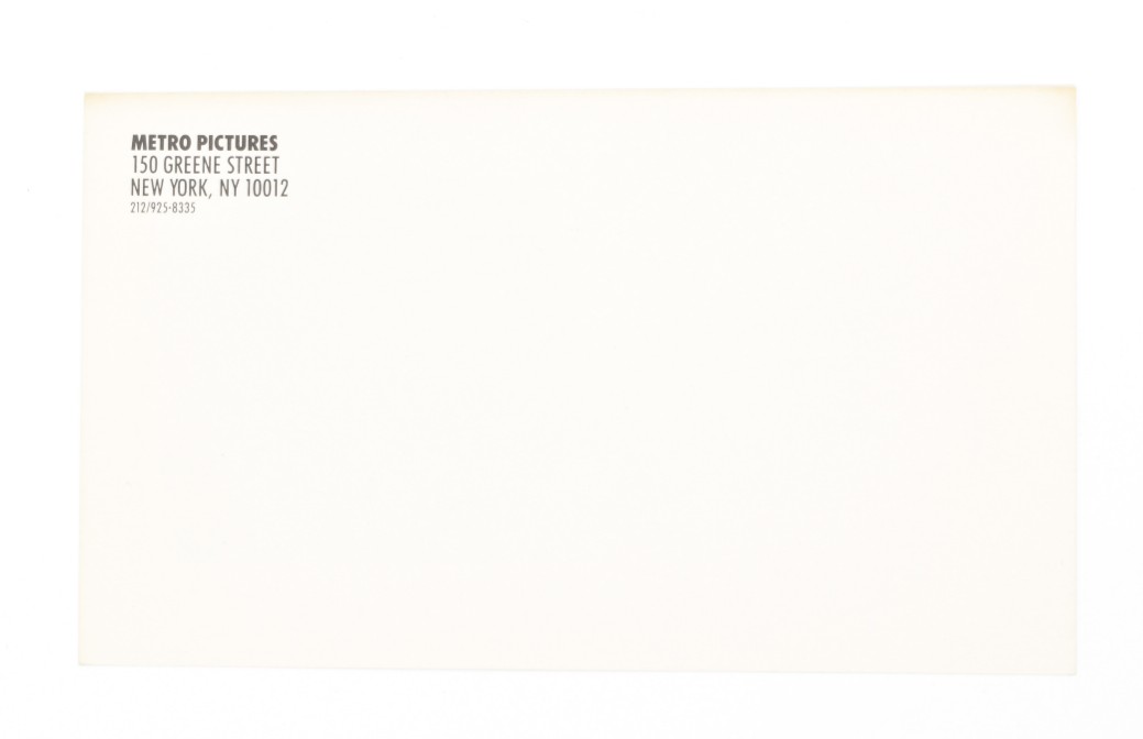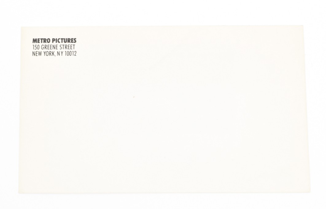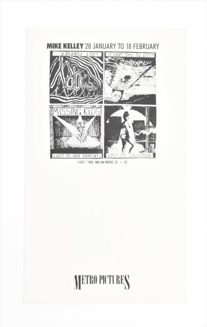 (1) Super rare invitation card for an early Mike Kelley show held January 28 - February 18, 1984. 15 x 9 cm. Features a small reproduction of Kelley's drawing 'Lost', 1983. Tiny bend at lower left corner, else a very good copy.