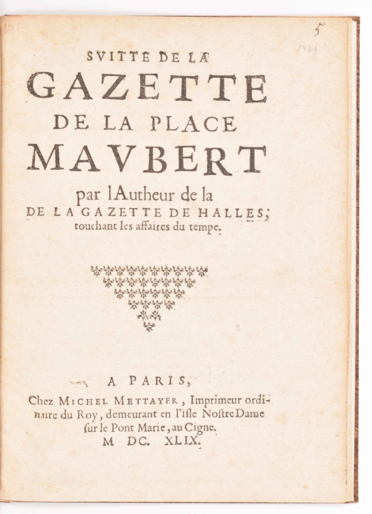 touchant les affairs du temps. Première nouvelle. Paris, Michel Mettayer, 1649, 7 p., modern gilt-lettered boards, 4to.
